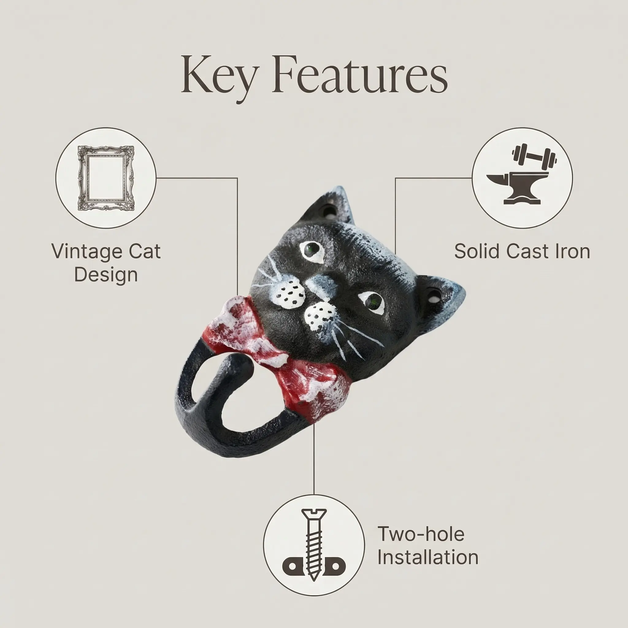 Vintage Cast Iron Cat Hook, Entryway Key Holder, Cute Bow Tie Cat Decorative Coat Hanger, Pet Leash Hanging Hook