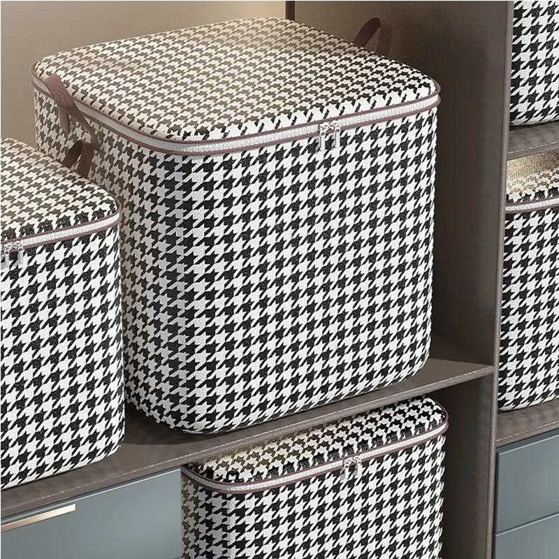 1. Fabric Storage Box: Houndstooth printing, two-way zipper, large opening design, the lid on the storage box can prevent dust and keep clothes and toys clean, very convenient and practical.
