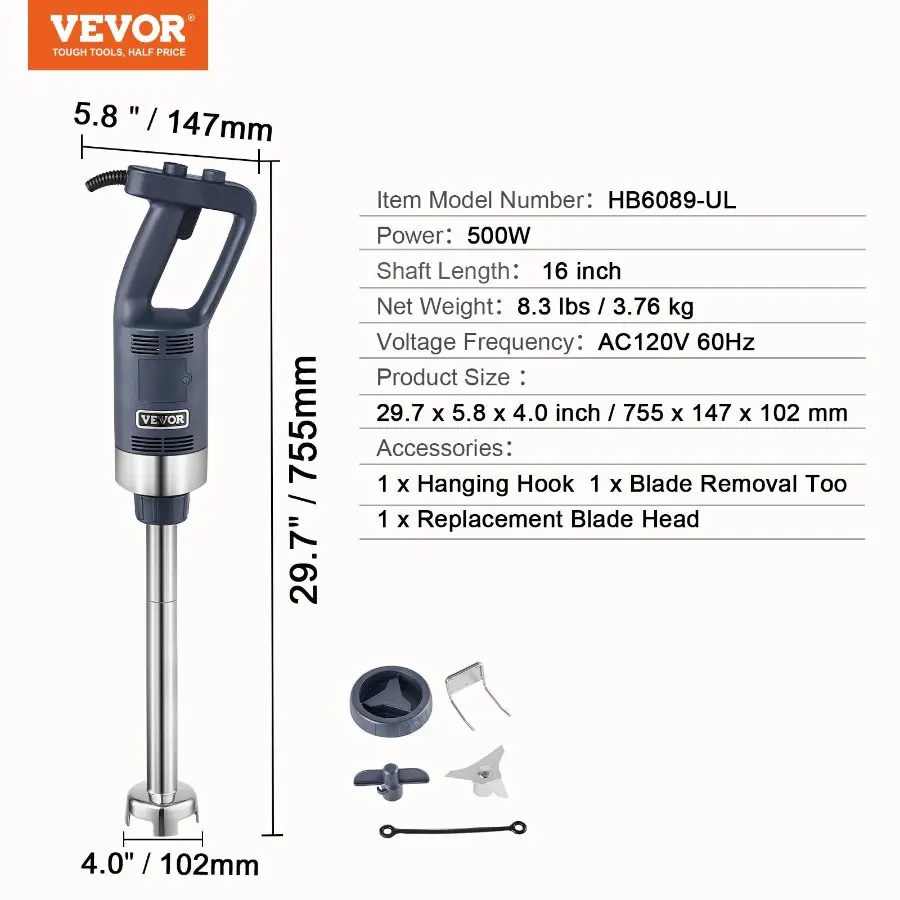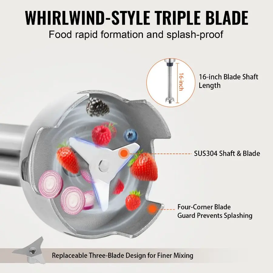 VEVOR Commercial Immersion Blender, 500W Heavy Duty Hand Mixer, 16 inch Stepless Variable Speed Mixer with Stainless Steel Blade, Multi-Purpose Portable Mixer for Soup, Sauces, Mashed Potatoes, Cream