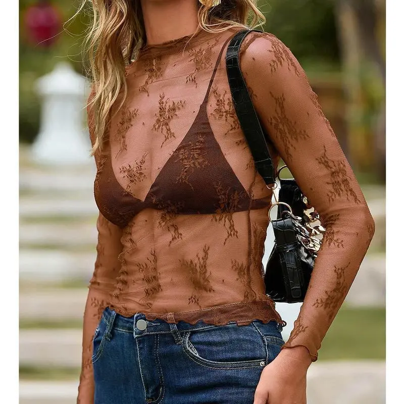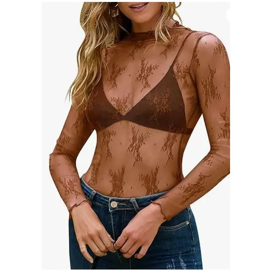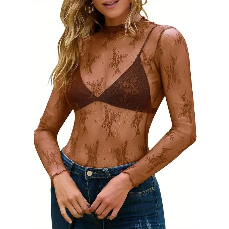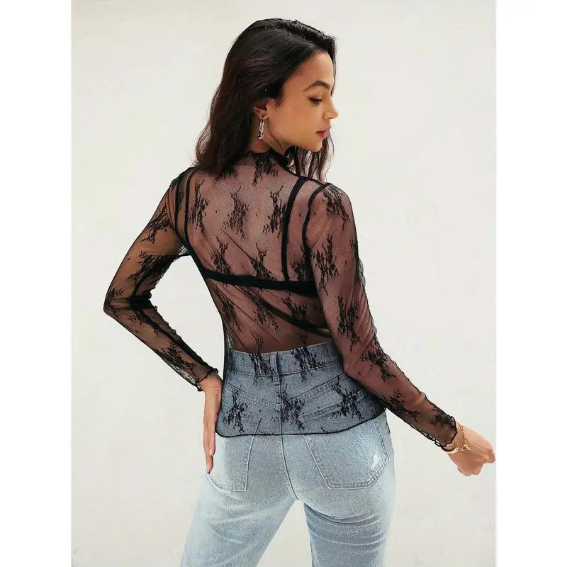 Women'S Lace Mesh Sheer Long Sleeve Layer Top High Neck Lace Floral Sheer Basic Shirt Top For All Seasons(Sheets)