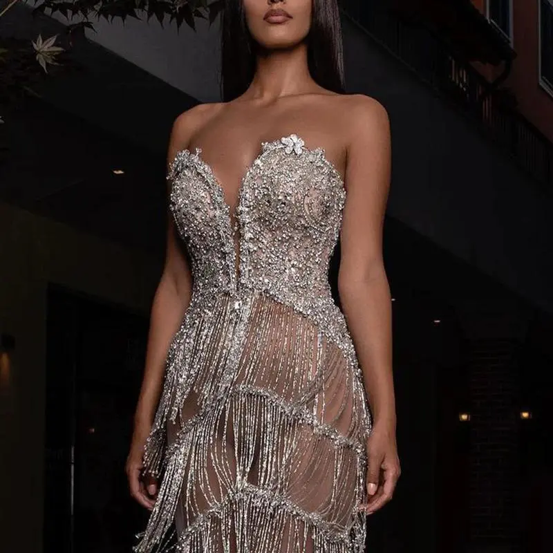 Dazzle at every event in this stunning tassel sequin dress!Designed for maximum impact, this sleeveless gown features a daring backless and strapless neckline with shimmering sequin coverage.The fringe mesh overlay adds mesmerizing movement while the bodycon silhouette hugs your curves./Perfect for cocktail parties, evening galas, or New Year's celebrations, this elegant yet sexy dress ensures you'll be the center of attention.The built-in corset provides support while allowing you to dance all night in glamorous comfort./Key Features:/Thousands of hand-sewn sequins for head-turning sparkle/Sexy strapless backless design with secure fit/Flirty fringe detailing with sheer mesh overlay/Built-in corset for support and shaping/Body-hugging silhouette that flatters all figures/Elevate your wardrobe with this eye-catching dress, designed to make you shine at any event.