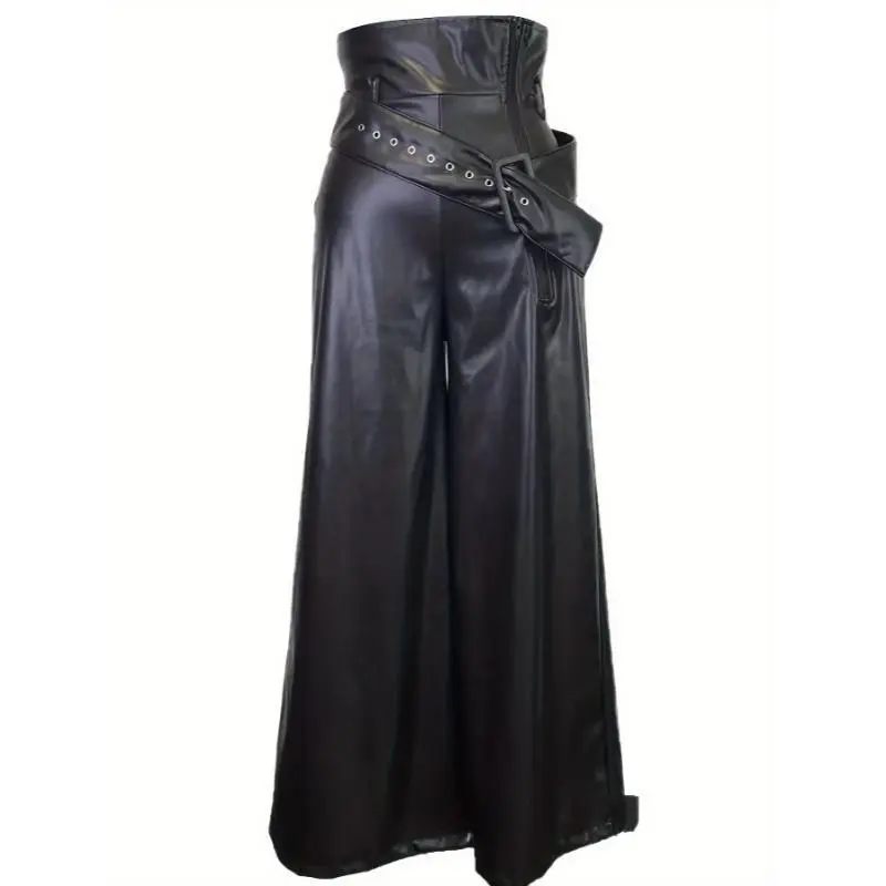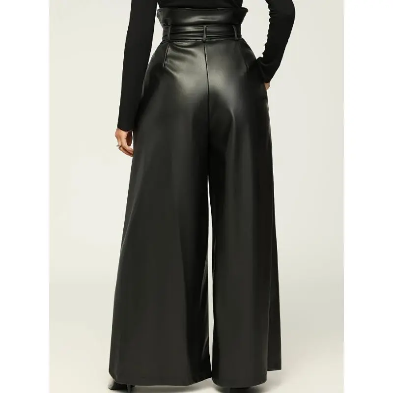 Elegant Wide-Leg PU Leather Pants with Metal Belt - Non-Sheer, Solid Color, All-Season Fashion for Women(Sheets)