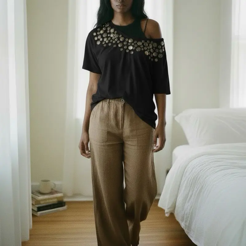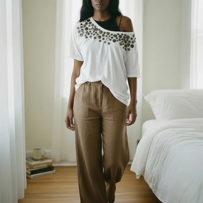 Ladies SS Off-Shoulder Embellished Tee with Elegant Beading and Comfortable Fit for Everyday Wear