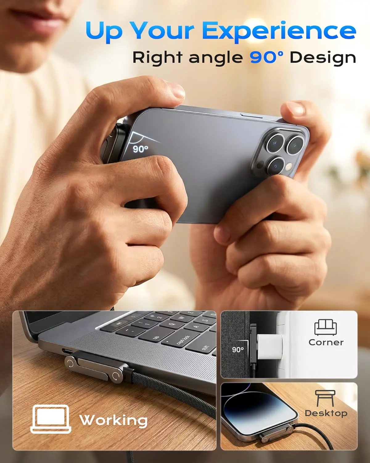 ·90 Degree USB C to USB C Cable: 90-degree angled T-shaped design reduces port strain and keeps you charge effortlessly without compromising grip or hand feel. Moreover, our cable has undergone stable usage tests and is compatible with most phone cases (thickness ≤ 0.08 inches, interface opening ≥ 0.45 inches)