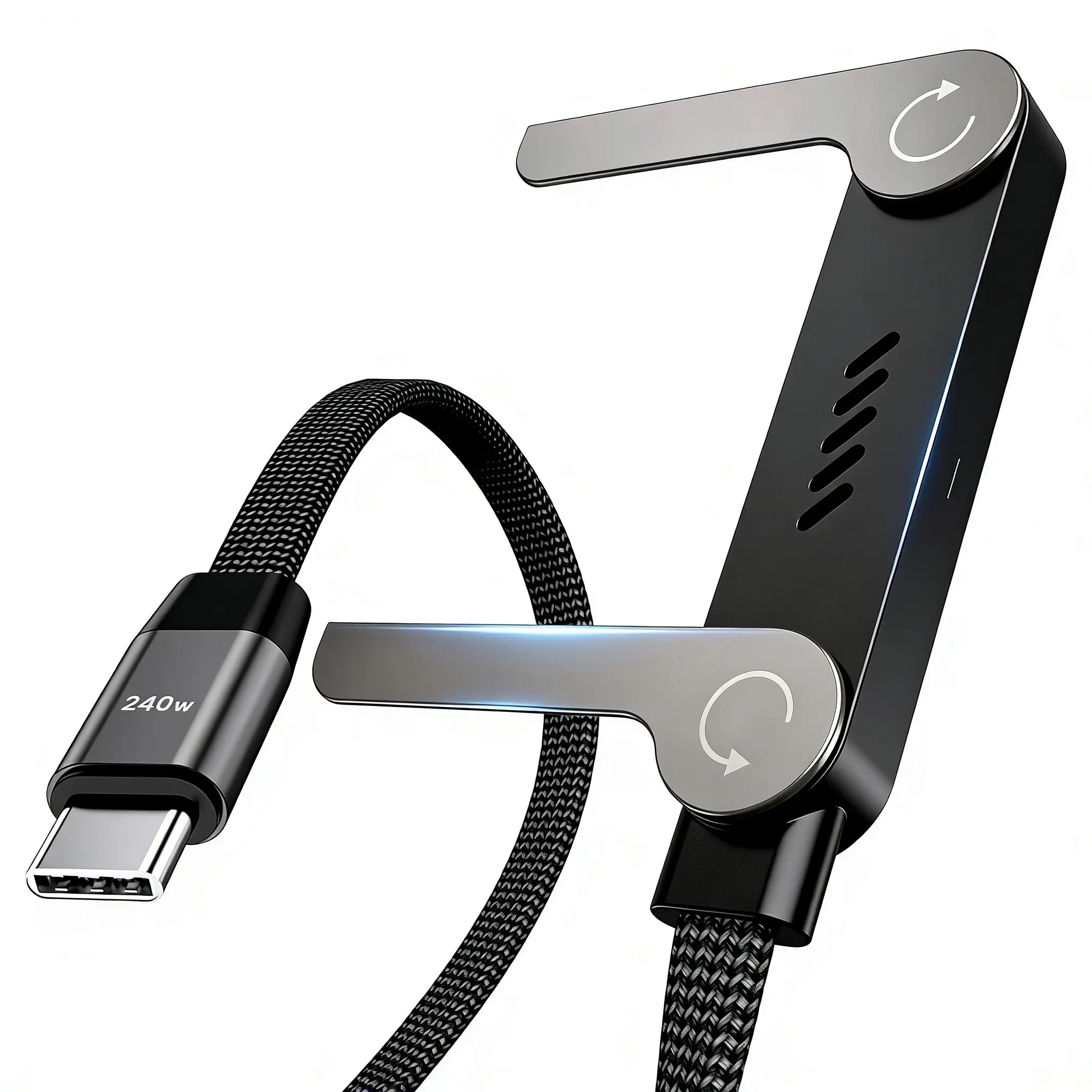 USB C to USB C Cable, 240W Fast Charging Cable with Built-in Phone Stand (5 FT, Black), Durable Braided Type-C Cable with 90° Angled T-Shaped Stand (1PCS)