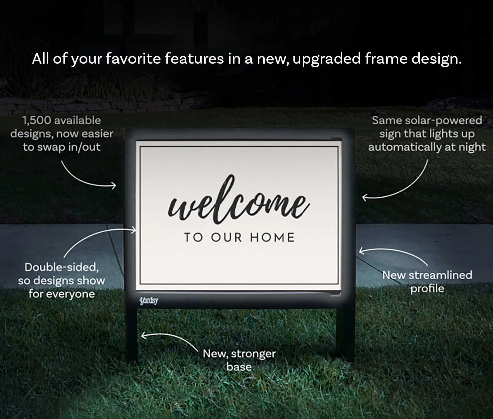 The Yardsy Sign is more than a yard sign, it's a canvas for creativity. With swappable prints, it's easier than ever to decorate your yard for holidays, cheer on your favorite sports team, celebrate your recent graduate, or spread awareness for a cause you care about. Yardsy is solar powered and illuminates for 8 hours each night bathing your lawn with a soft glow and highlighting your chosen print for all to see.