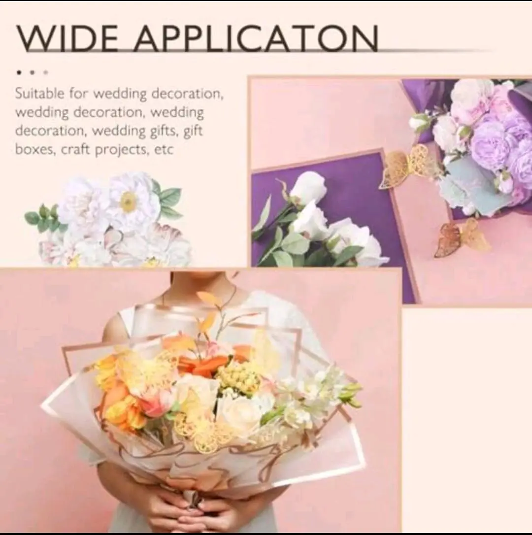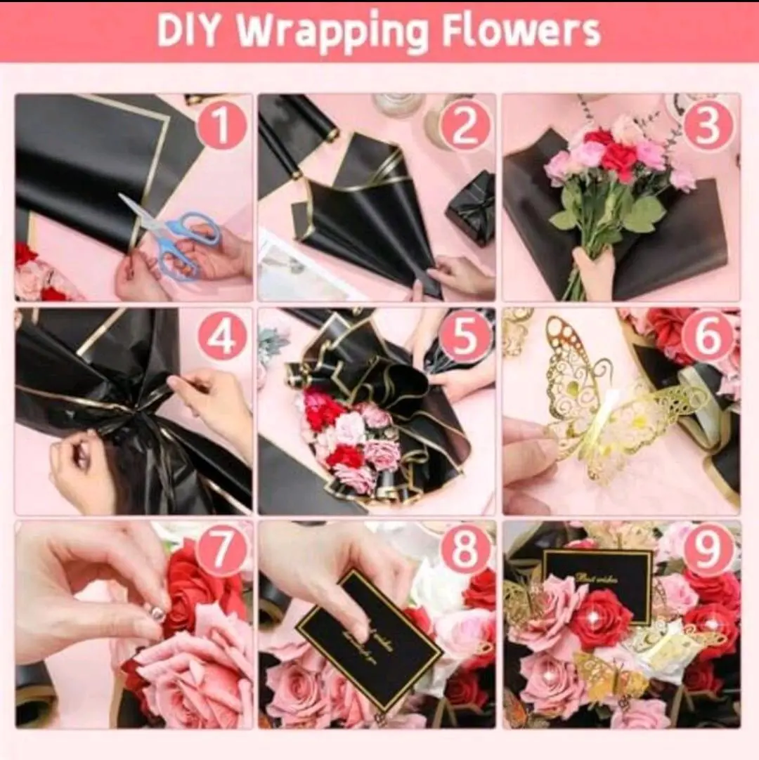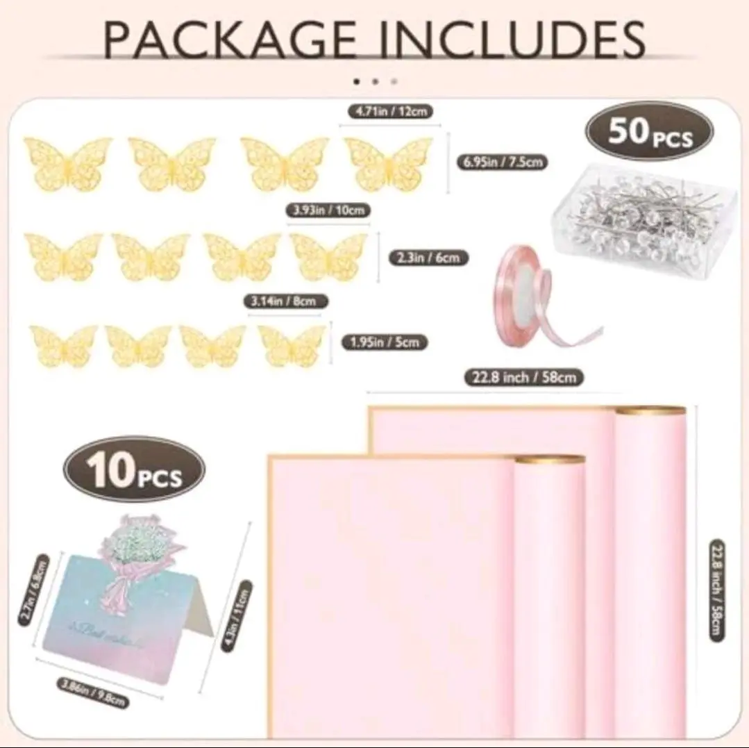 Elegant waterproof flower wrapping paper set perfect for bouquet packaging and gift decoration. Includes wrapping paper, greeting cards and butterfly decor for a beautiful presentation. Great for birthdays, weddings, Valentine’s Day, Mother’s Day and special occasions. Easy to use and ideal for florists, gift shops and DIY bouquet wrapping.