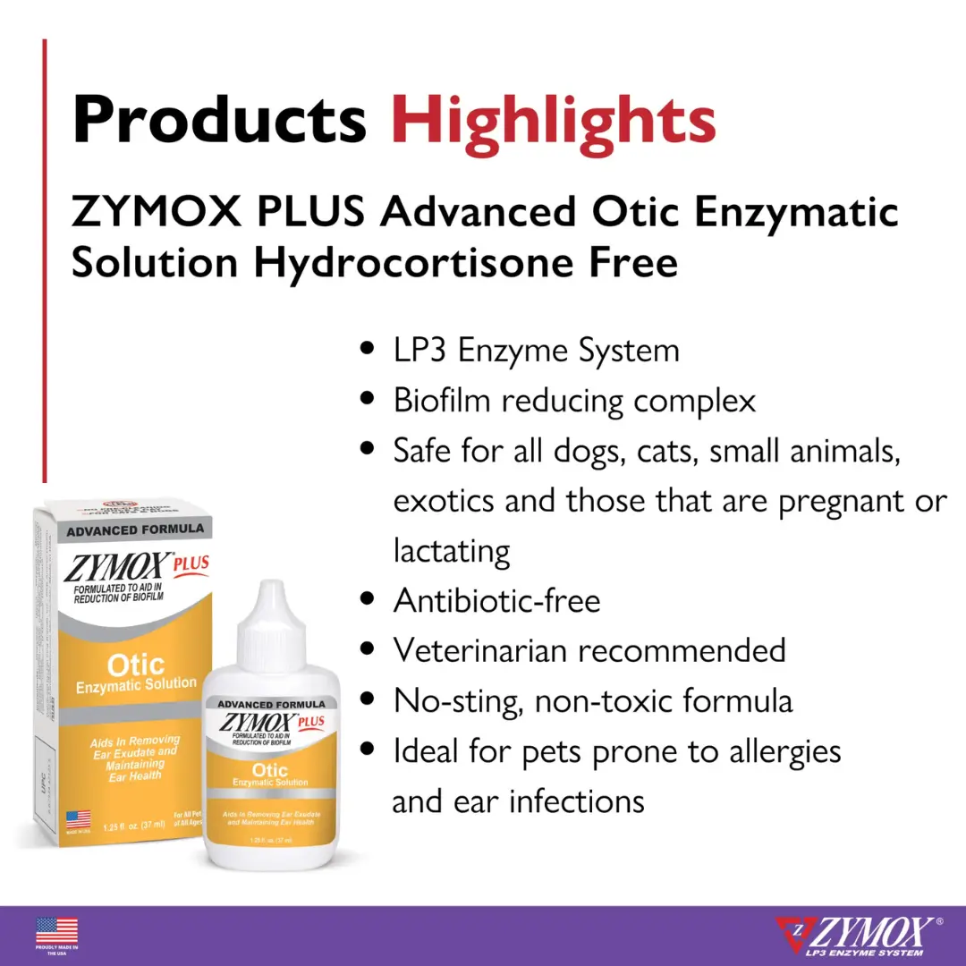 ZYMOX Plus Advanced Otic Ear Treatment Without Hydrocortisone is an advanced, non-toxic enzymatic ear solution designed to help manage chronic or difficult otitis externa in dogs and cats. Featuring the patented LP3 Enzyme System enhanced with biofilm-reducing enzymes, the formula targets stubborn microbial biofilms while helping remove ear exudate and debris. The hydrocortisone-free solution is applied once daily into an uncleaned ear canal, with no pre-cleaning required.