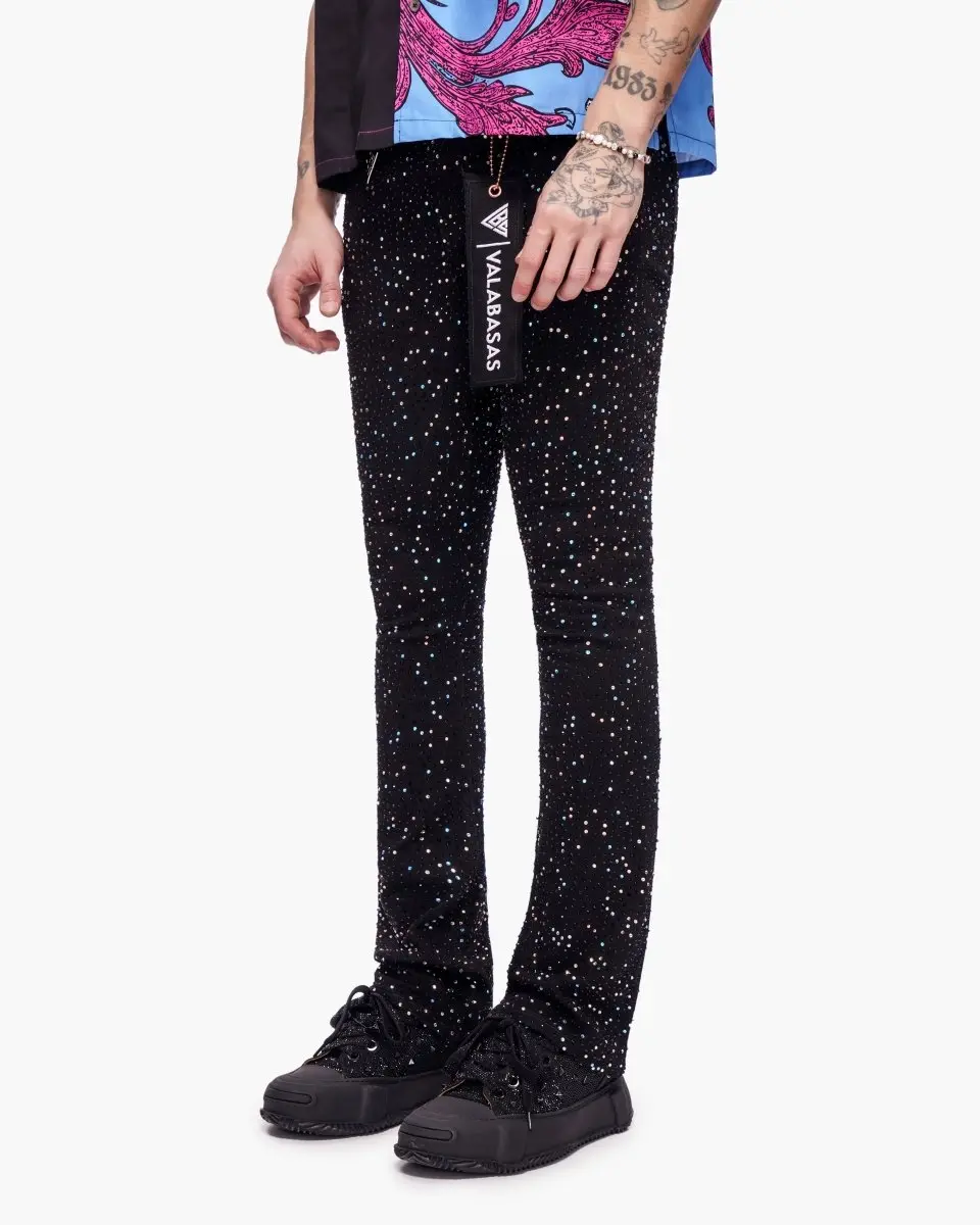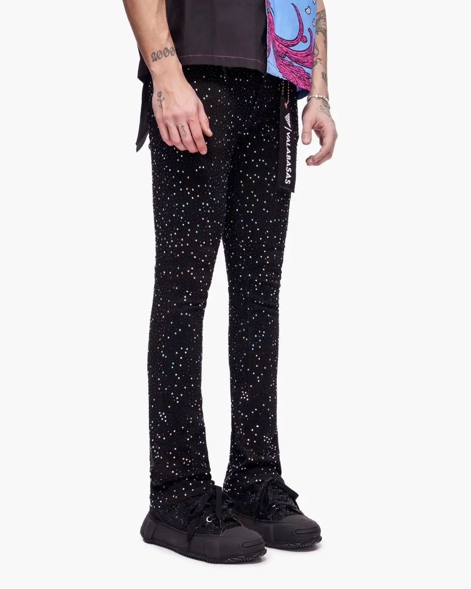 Constructed in jet black stretch denim, the jeans are covered in multi-tone rhinestone detailing, creating a galaxy-like effect that hits from every angle. The slim stacked fit enhances the leg profile while maintaining comfort and mobility.