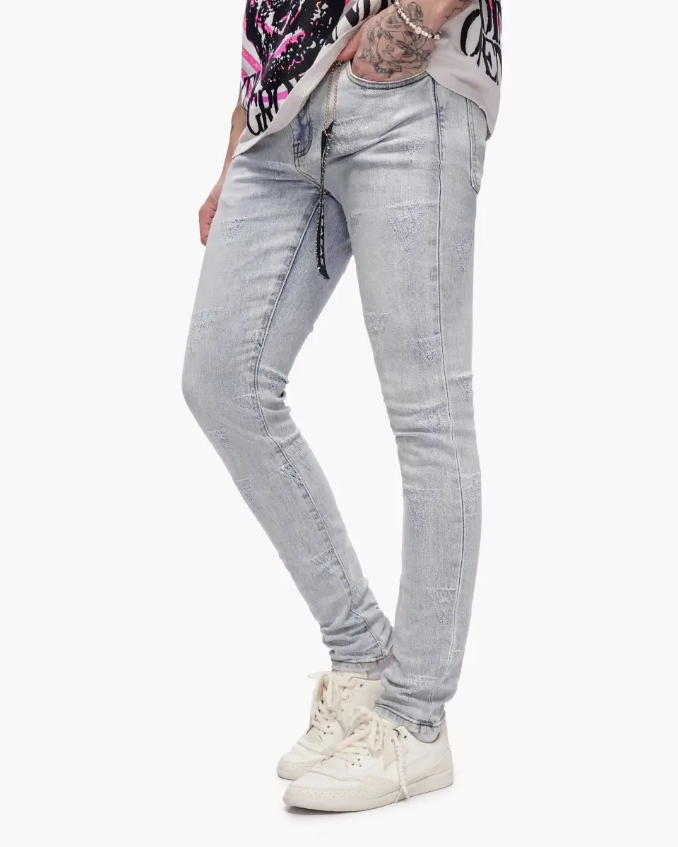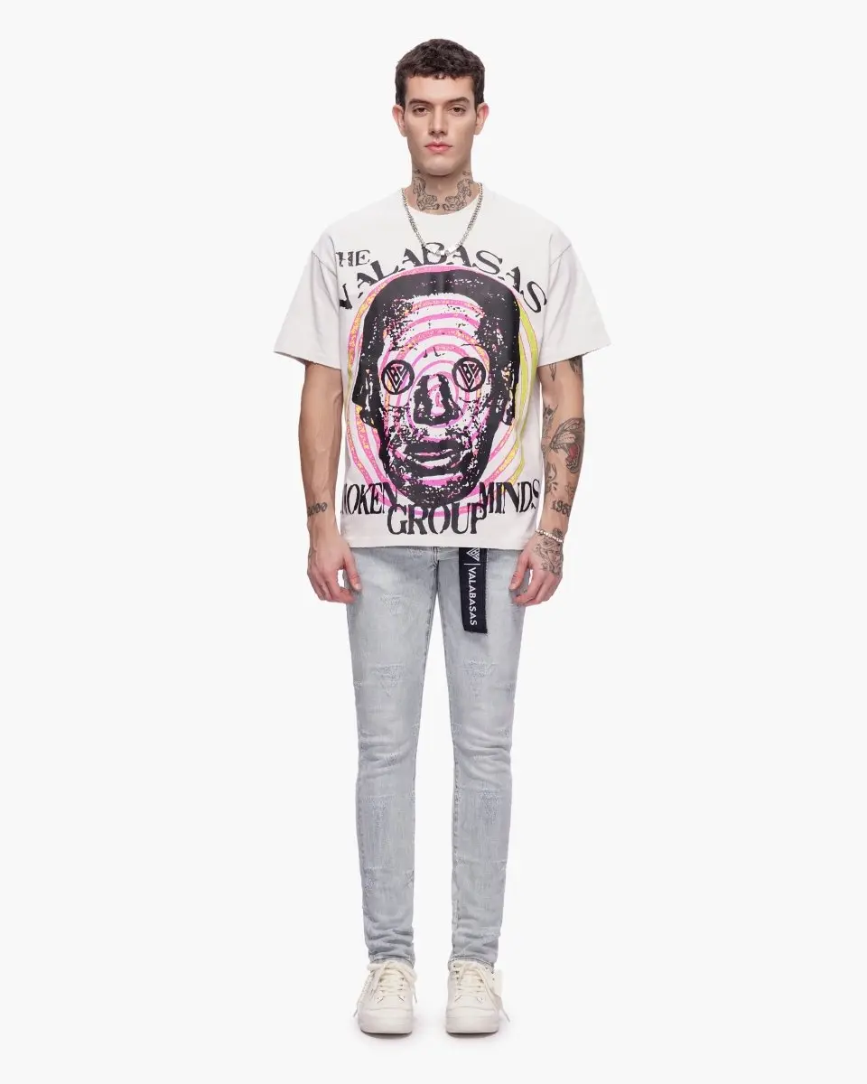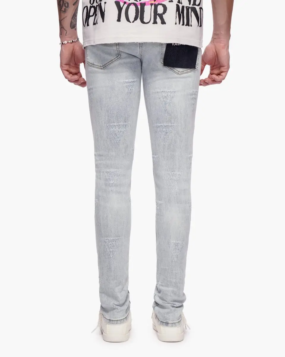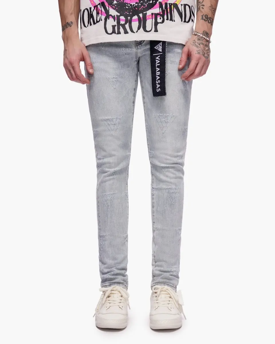Crafted in a vintage-inspired wash, the denim features tonal Valabasas logo motifs throughout, adding texture without overpowering the design. The soft fading and worn-in finish enhance the overall aesthetic, giving the jeans a balanced mix of minimalism and statement detail.