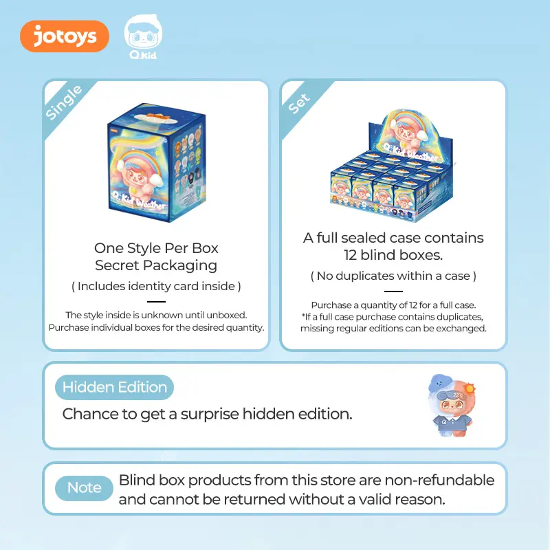 The JOTOYS Q.Kid Weather Series MINI Plush Blind Box is a collectible plush toy featuring 13 designs, including 1 hidden design. The probability of obtaining specific designs is low. Minor defects are common, but serious defects can be addressed through after-sale service. The product is not eligible for refunds or exchanges, except for defects. Due to measurement and display differences, the actual product may vary slightly from the image.