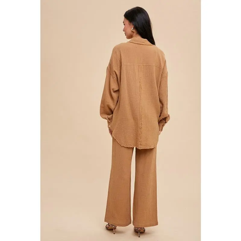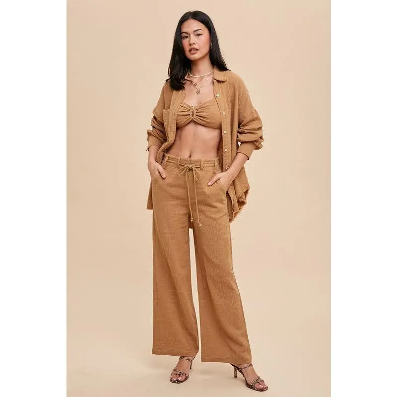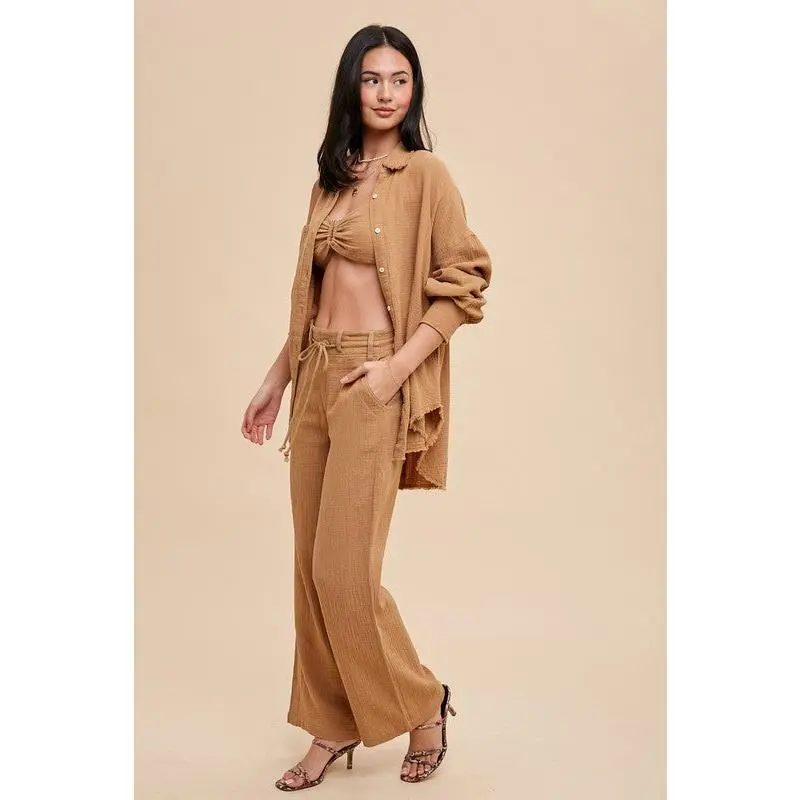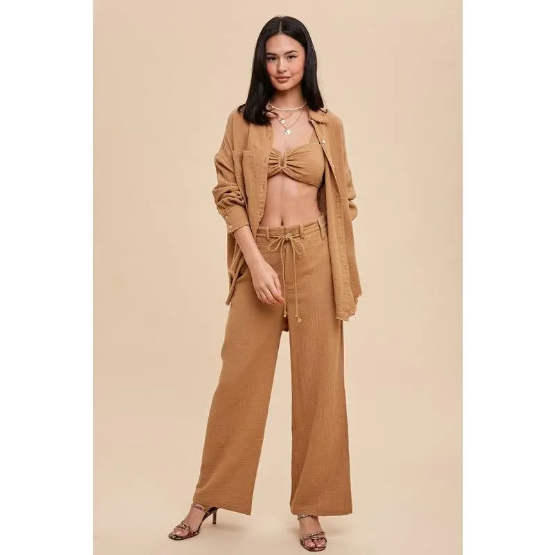 Three pieces, endless style. this set features a long sleeve button-down top, a notched bralette, and wide leg bottoms with a tunnel drawstring tie. wear it layered or mix and match for effortless, everyday chic.