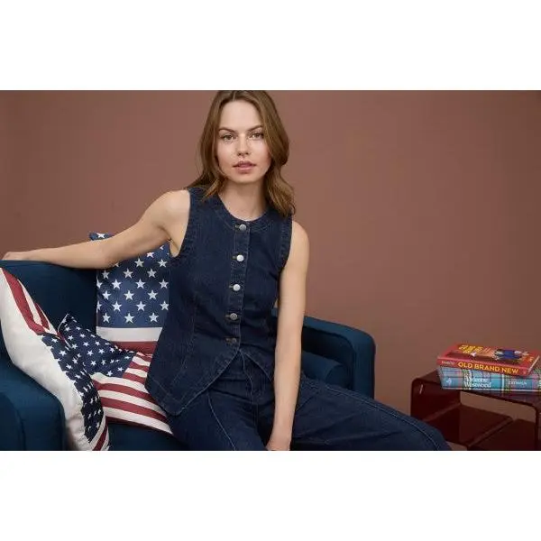 Level up your layering game with this effortlessly cool denim vest. Featuring a round neckline and sleeveless cut.