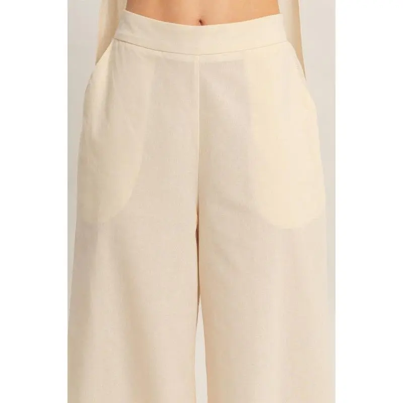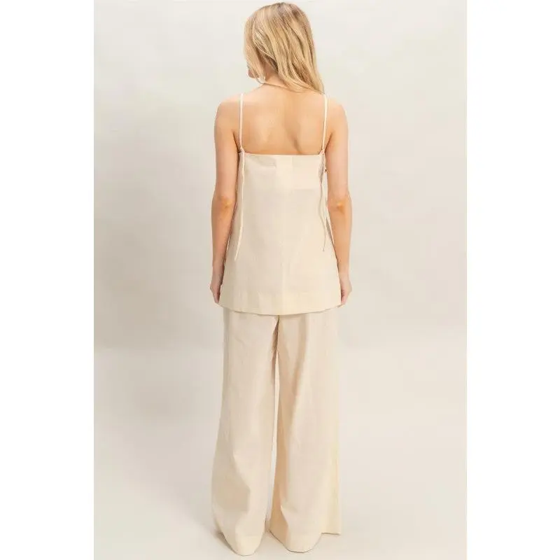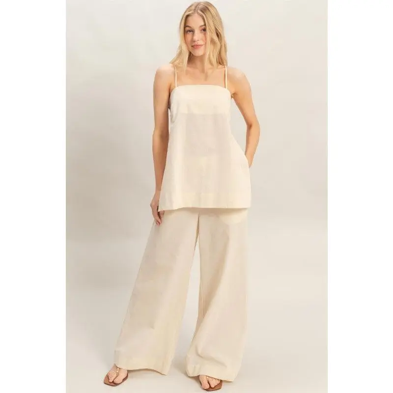 Two-piece set features a spaghetti strap top with a relaxed fit and side slits for ease of movement, complemented by wide-leg pants with elastic waistband and pockets.
