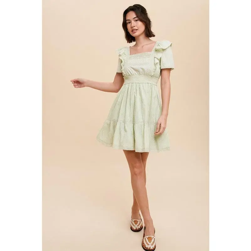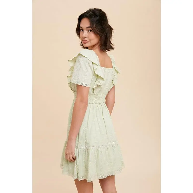 This mini dress features ruffle shoulders, a smocked waist, and delicate lace details. fully lined for comfort, it’s perfect for date nights or weekend outings.