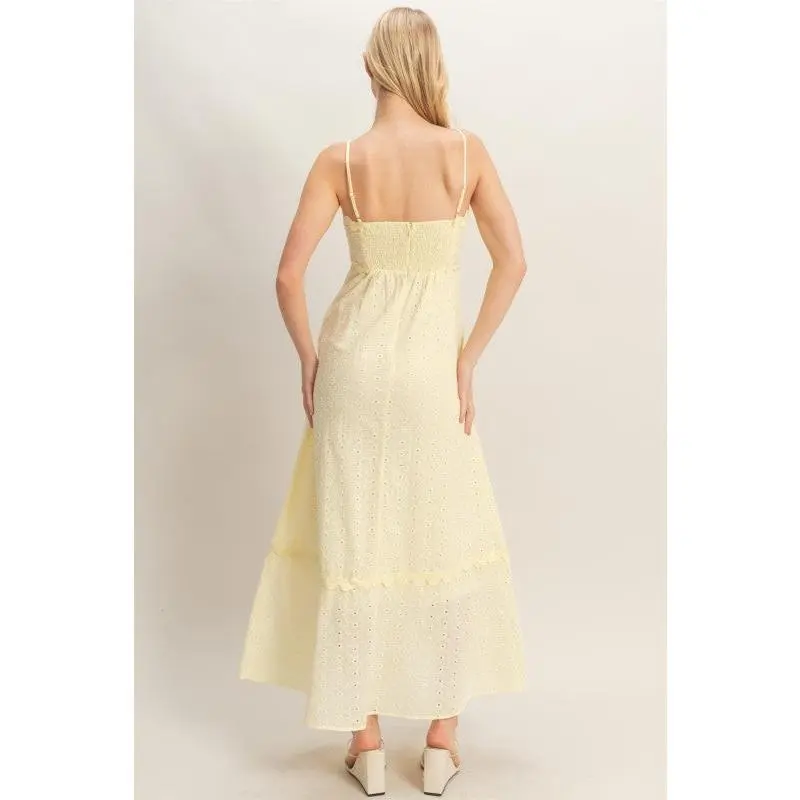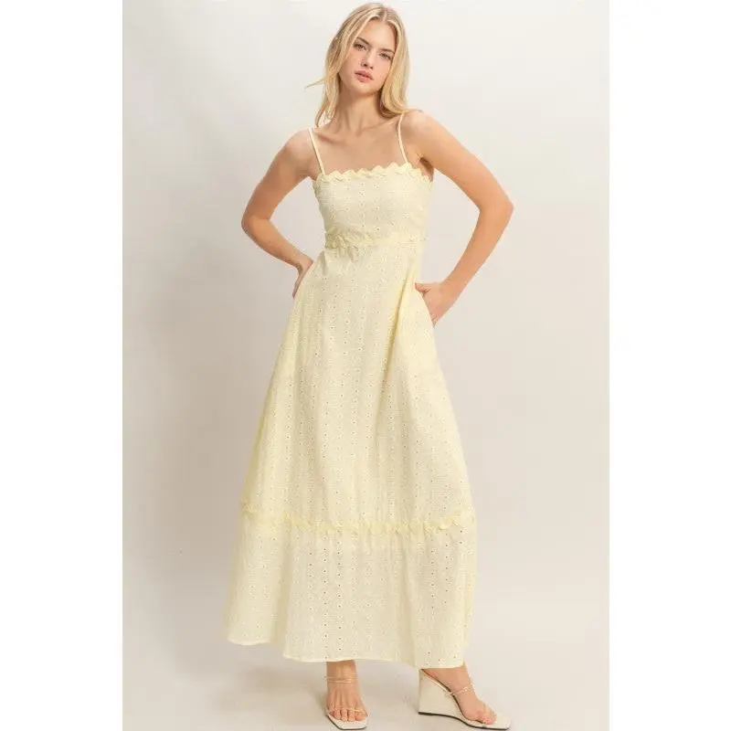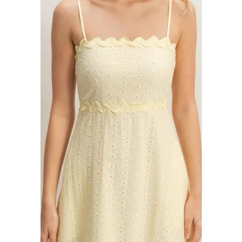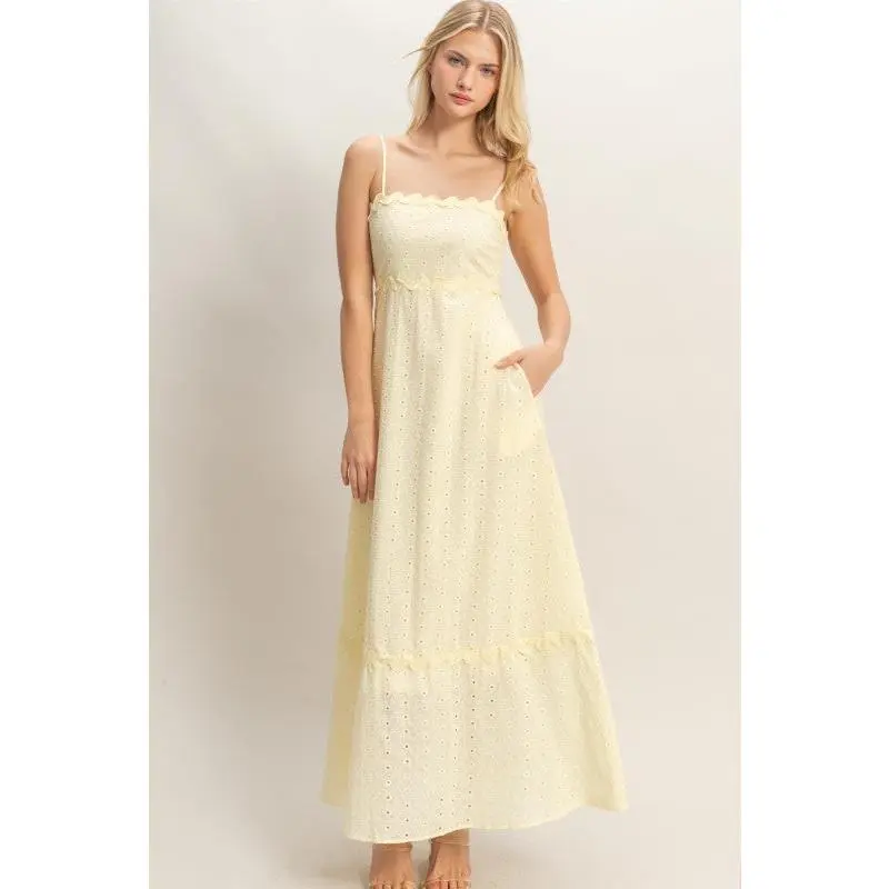 This elegant midi dress is all about soft romance and effortless charm. Designed with delicate spaghetti straps and the sweetest scallop trim, it flows into a breezy eyelet silhouette that moves beautifully with every step. Light, airy, and oh-so-dreamy, it’s the kind of dress that makes golden hour feel even more magical.