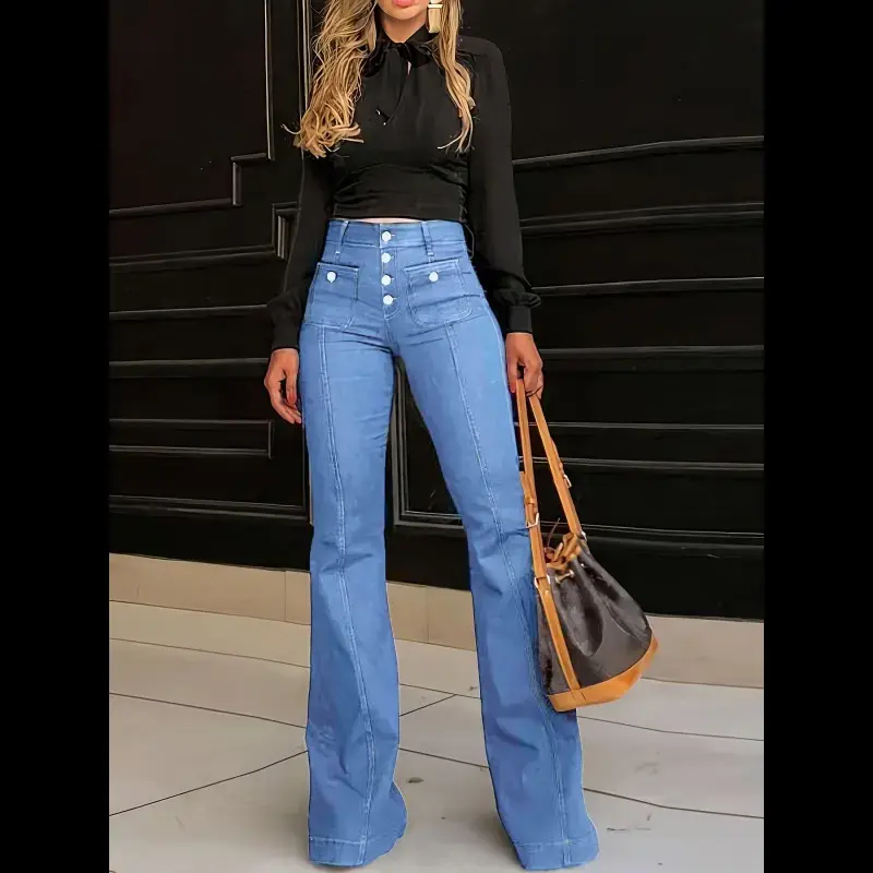 2025 Spring New Style Button High Waist Jeans Women's Slim Fashionable Temperament Elegant Flared Pants Trousers Denim Bell Bottoms Bellbottomjeans Womenswear