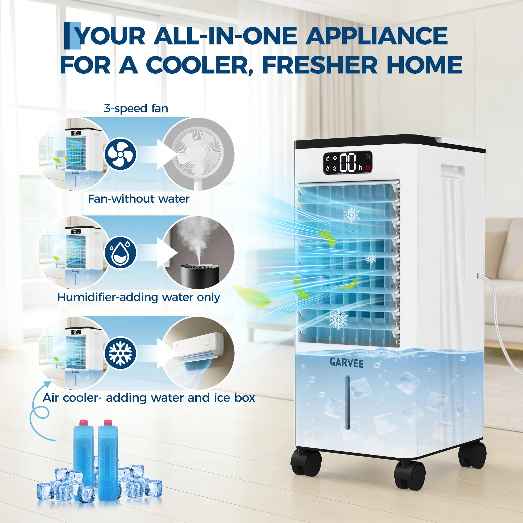Efficient 3-in-1 Cooling System:This versatile evaporative air cooler functions as both a high-velocity fan and a natural swamp cooler. By adding water or ice packs to the 1.85 Gal tank, it delivers a refreshing, chilled breeze to beat the summer heat without high energy costs.