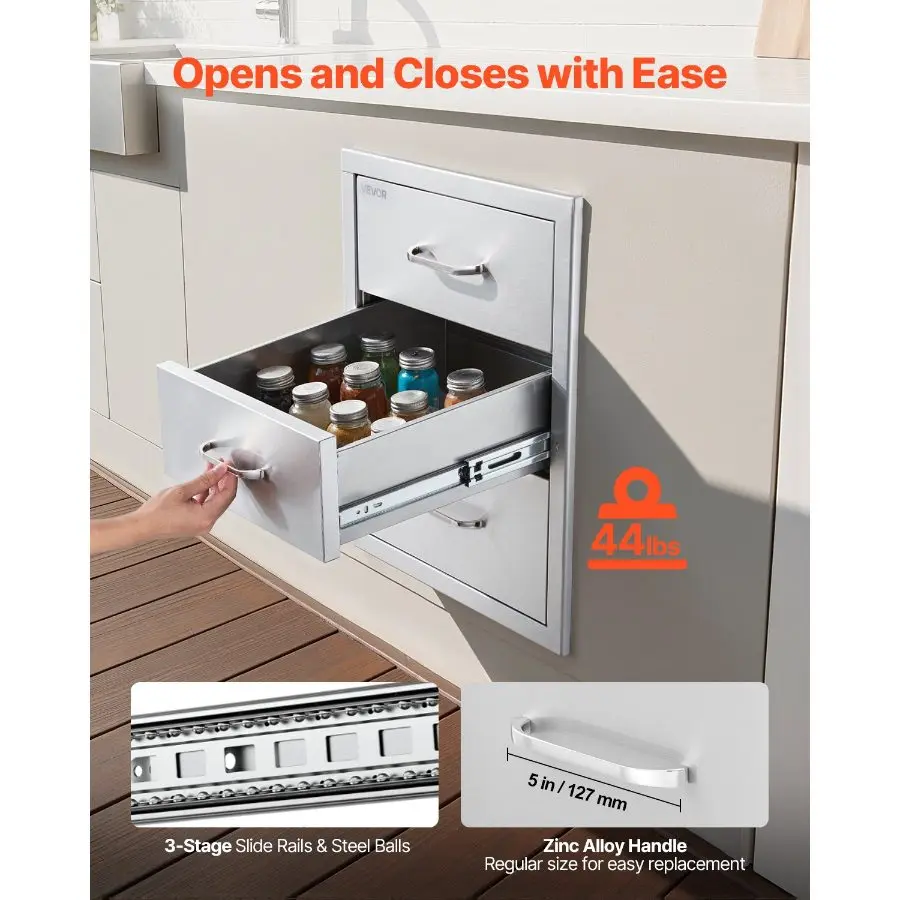 VEV Outdoor Kitchen Drawers 18.11 Wx 23.23 Dx 23.23 H, Triple-Access Stainless Steel Modular Drawer Cabinet with Handles, BBQ Island Drawer for Outdoor Kitchen or BBQ Island Patio Grill StationRounded EdgesBrushed Stainless SteelPremium Seamless WeldingComfortable Zinc Alloy HandleSmooth Sturdy Sliding RailsGentle Rounded EdgesSeamless Welding, Superior CraftsmanshipCutout Size: 17.13 Wx 23.43 Dx 21.65 H/ 435x 595x 550 mm, Item Model Number: SS-GL-01, Product Weight: 43 lb/ 19.55 kg, Material: Premium Stainless Steel, Max. Capacity/Tier: 44 lb/ 20 kg, Product Size: 18.11 Wx 23.23 Dx 23.23 H/ 460x 590x 590 mm