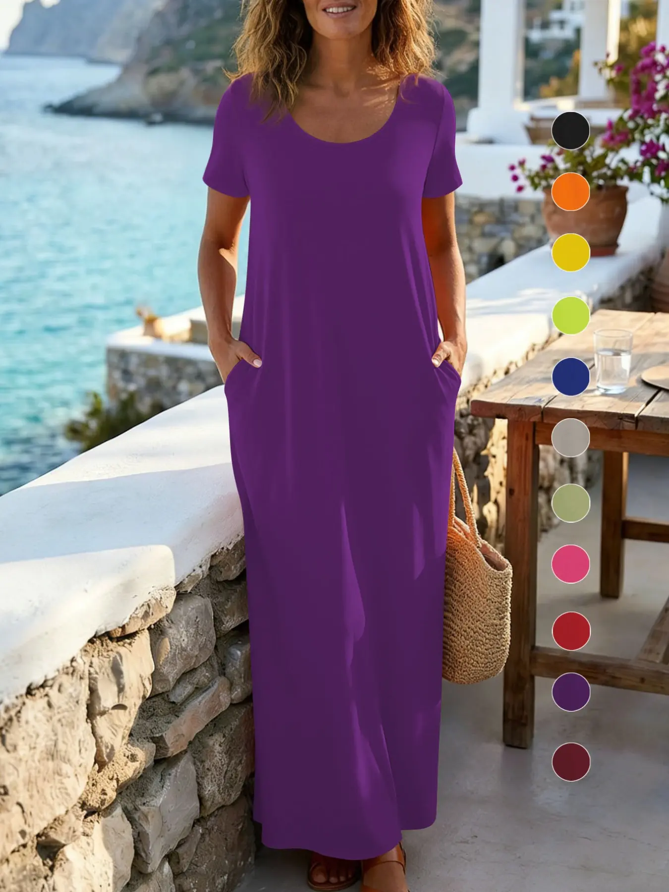 5. Plus Size Round Neck Short Sleeve Maxi Dress, Loose Flowy Hem, Curvy Friendly Long Dress