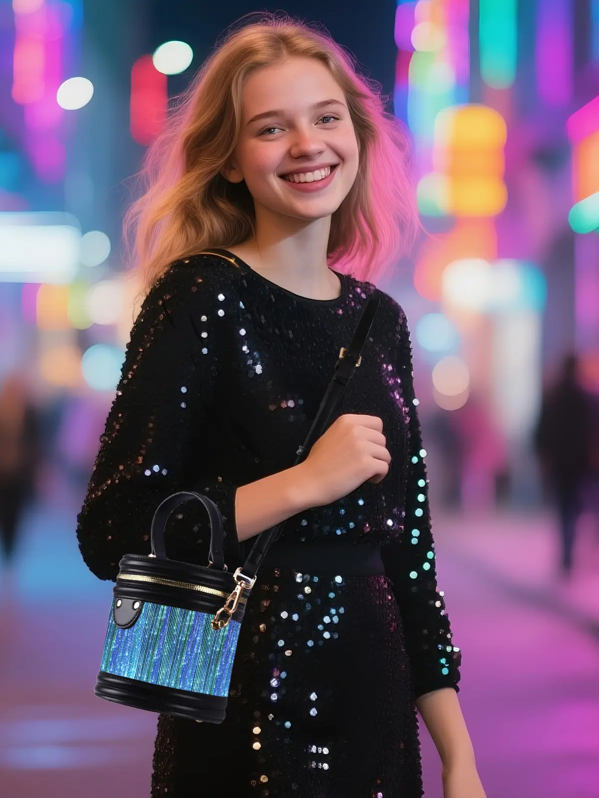 Unique Head-Turning Design: Stand out from the crowd with a one-of-a-kind glowing accessory that gets compliments everywhere you go. Versatile Wear: Handheld, top handle, or crossbody – wear it your way for any occasion. Long-Lasting Glow: Rechargeable battery delivers hours of continuous light for a full night out. Gift-Worthy: The perfect gift for fashion lovers, ravers, festival-goers, or anyone who loves unique, fun accessories. Easy to Use: Simple one-button control makes switching lights effortless, even on the dancefloor.
