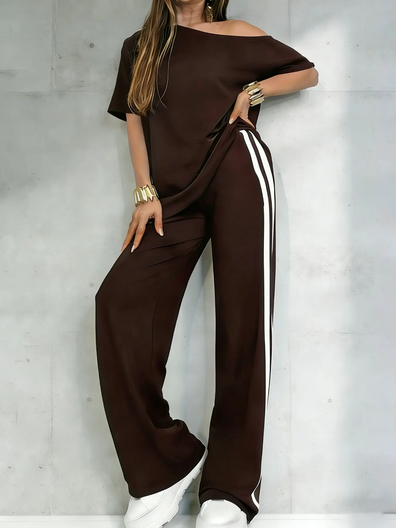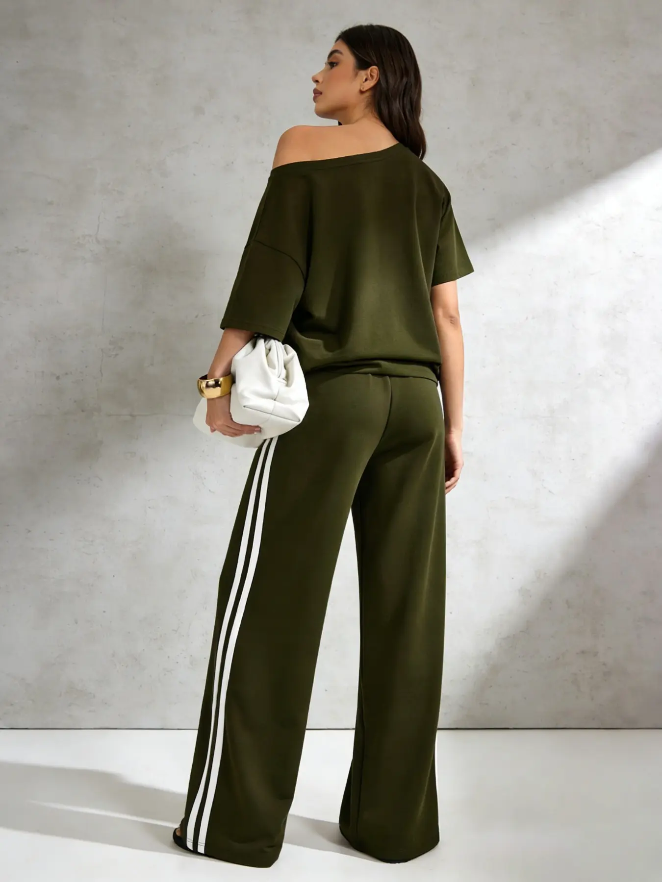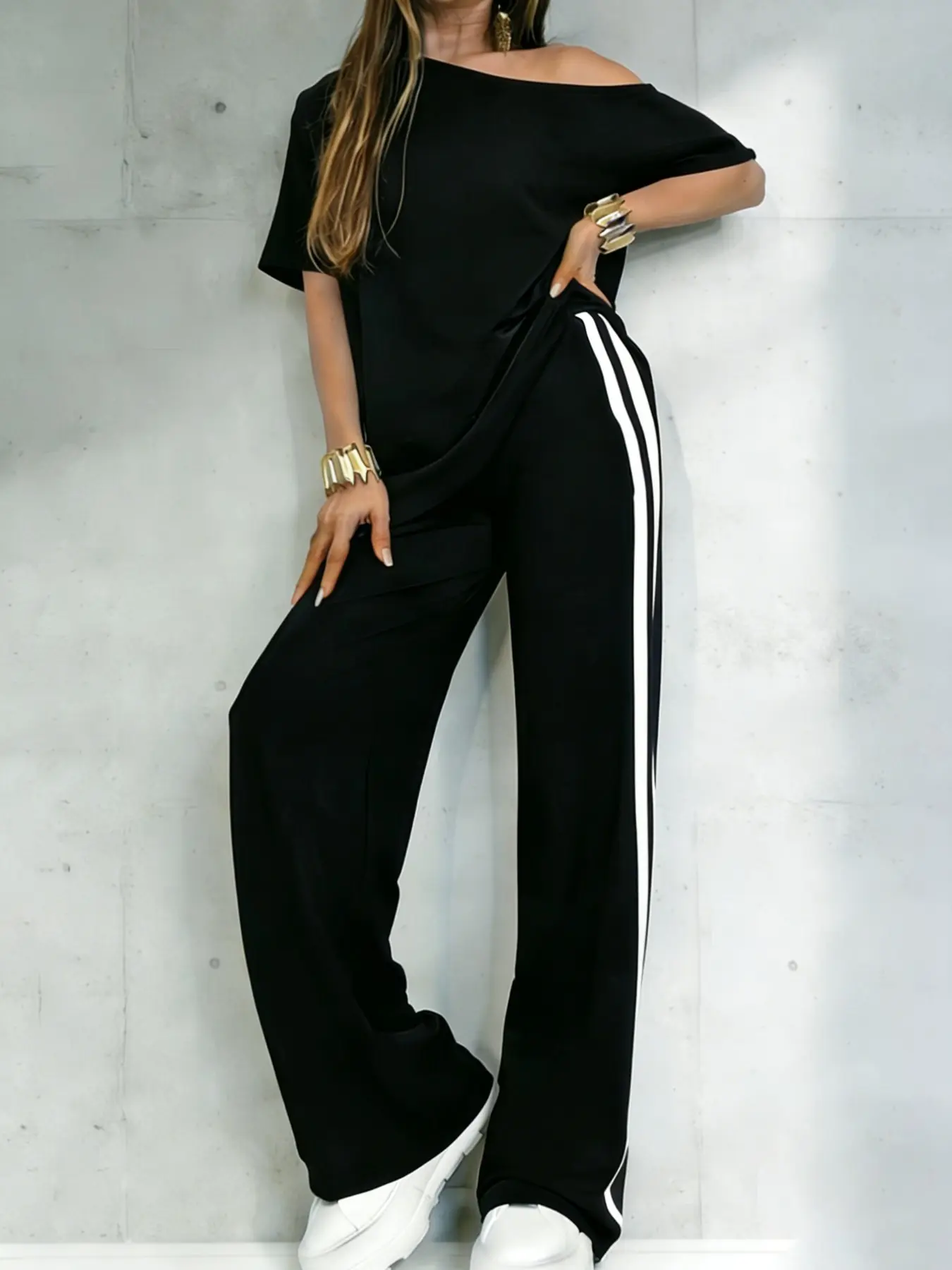 Women's Casual Sportswear Set, One-Shoulder Short Sleeve Top and Striped Long Pants, Spring Summer Two-Piece, Versatile Fashion