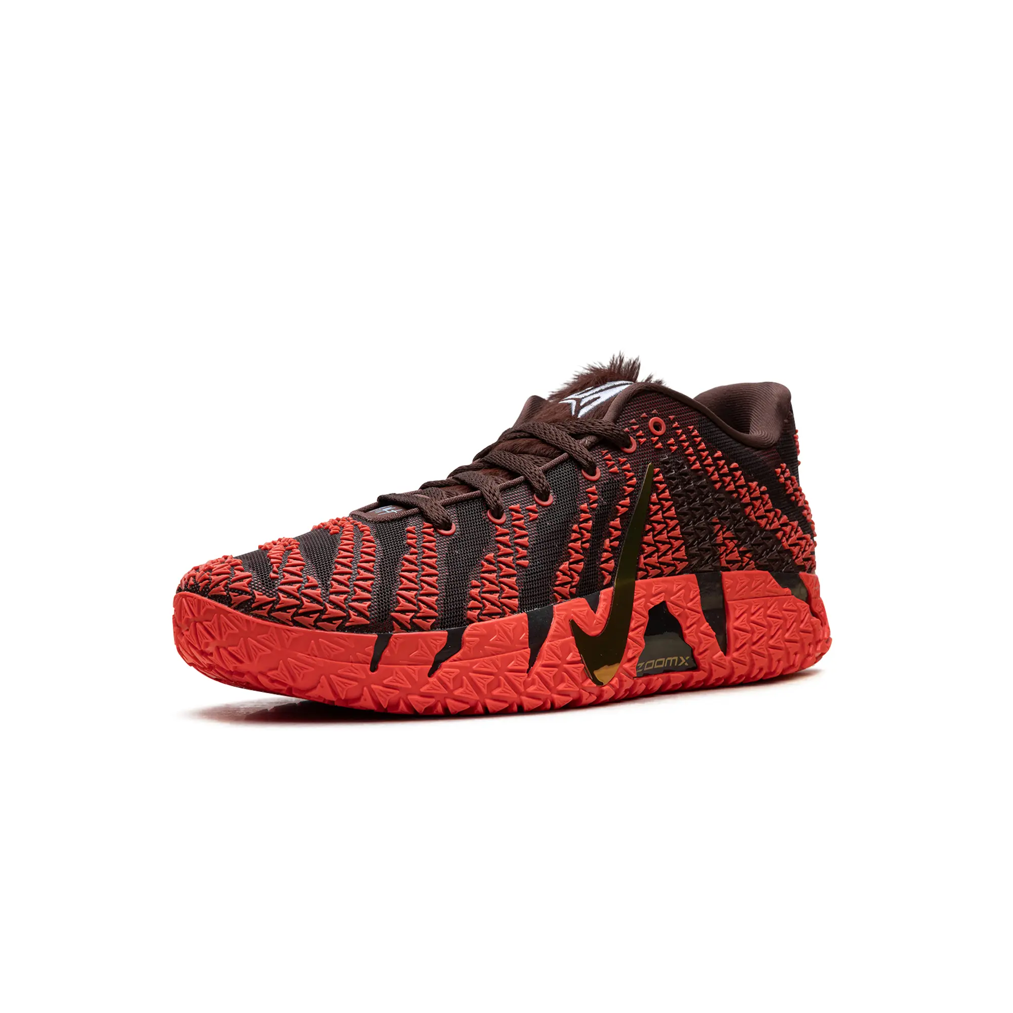 The Ja 3 "Year of the Horse" delivers a regal and high-octane tribute to the Chinese Zodiac, featuring a breathable engineered mesh upper in a deep "Mink Brown" and vibrant crimson red. This iteration is defined by its aggressive, claw-inspired TPU overlays and a specialized faux-fur texture on the tongue, paying homage to the power and grace of the horse. The rich, earthy landscape is sharply punctuated by a high-gloss metallic gold Swoosh, providing a celebratory and luxurious strike to the high-performance profile. Grounded by a sculpted red midsole housing a full-length ZoomX foam unit for elite energy return, this silhouette successfully pairs cultural storytelling with professional-grade basketball utility.
