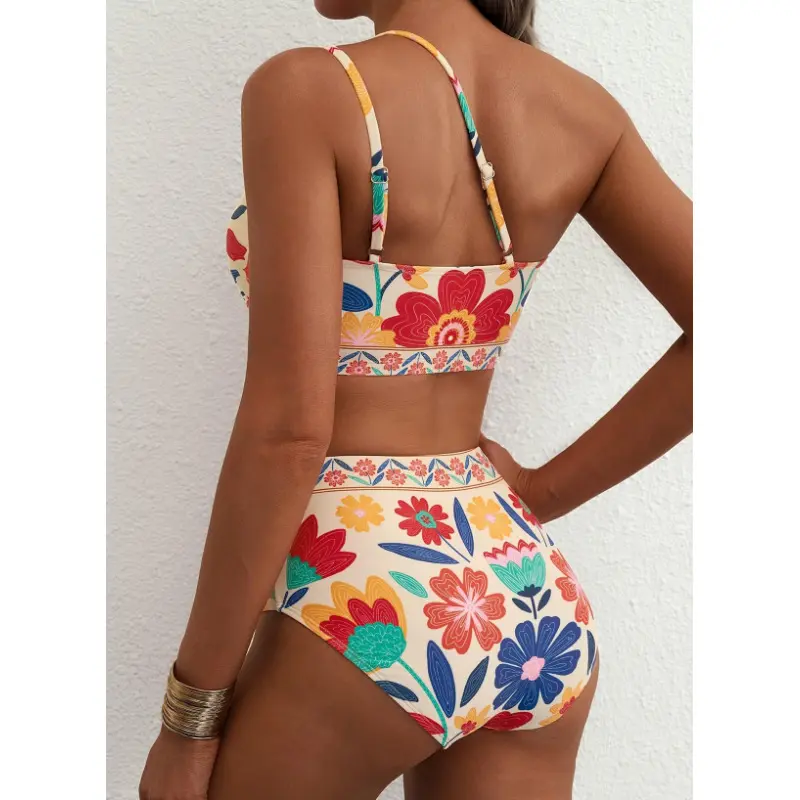 5. "Floral One-Shoulder Bikini Set - Vibrant High-Waist Swimwear for Summer"