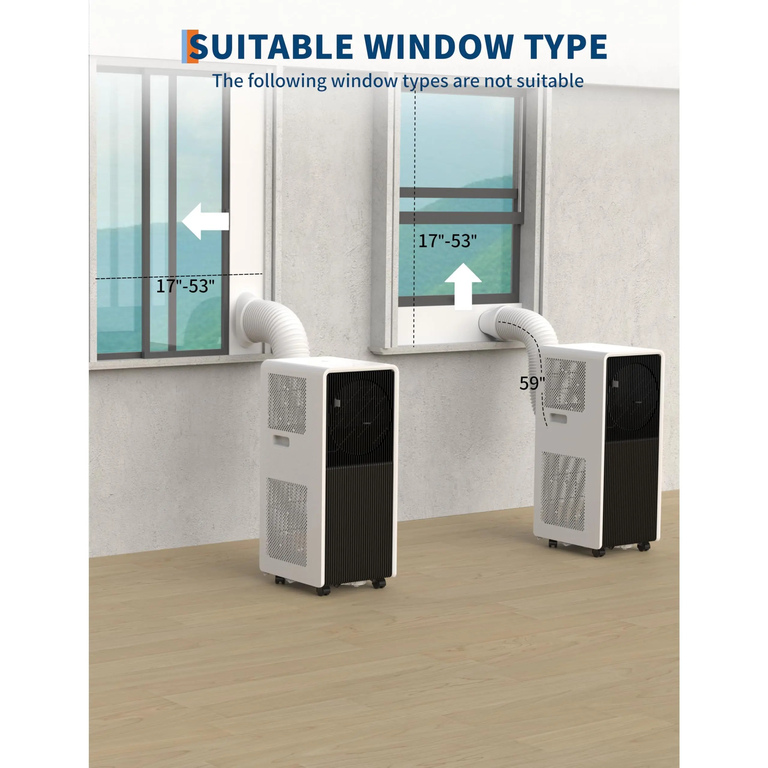 dual-hose design works as windowless air conditioner for apartments/dorms/offices
