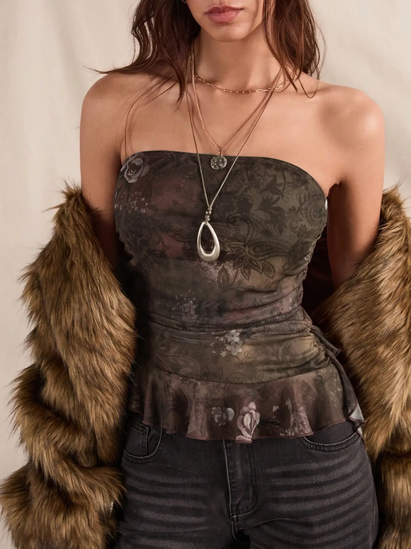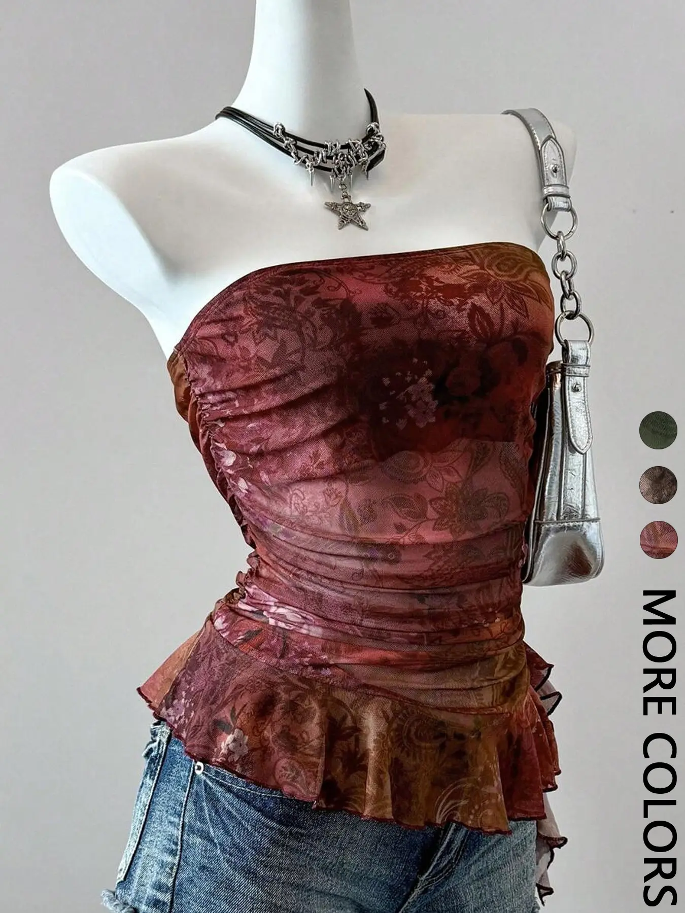 This Sheer Floral Tube Top is Grunge Fairy Y2K Vibes 🦋 | Ruched Ruffle Hem Mesh Top