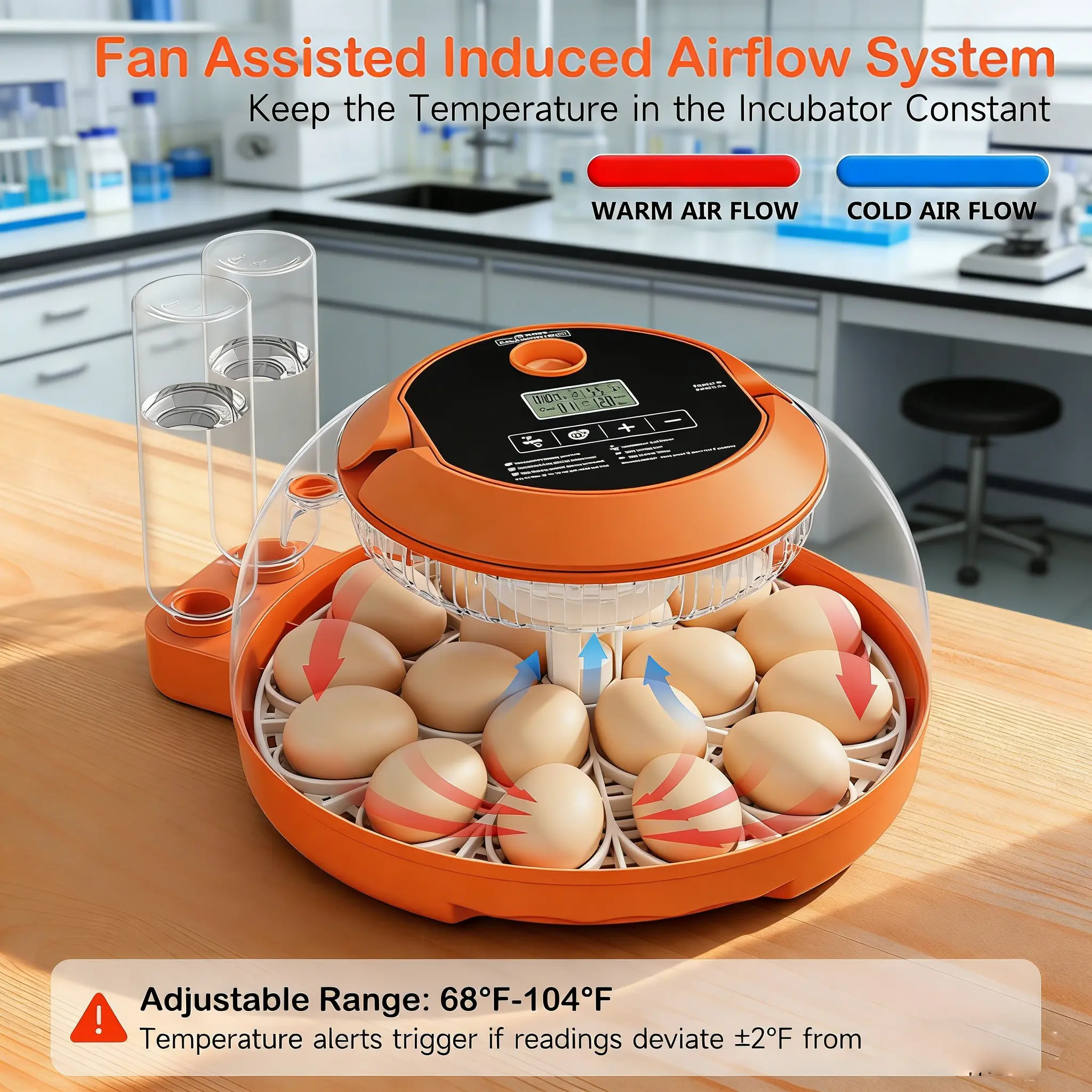 This digital incubator delivers professional-level temperature stability for successful hatching. Equipped with a quiet fan and even airflow design, it ensures consistent heating throughout the chamber. Real-time monitoring supports clear visual and sound alarms for abnormal conditions, effectively improving overall hatching success.