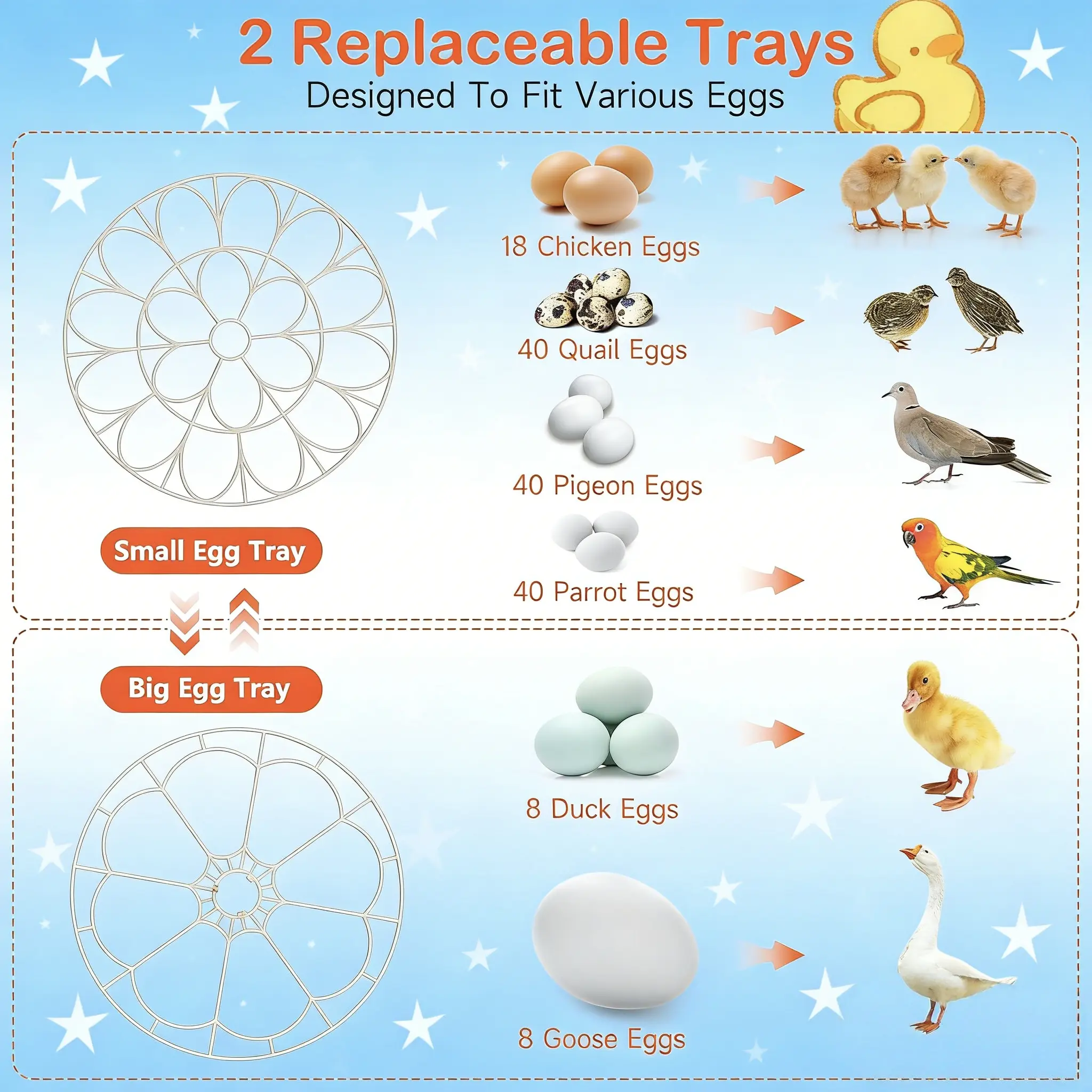 This incubator can hold up to 18 chicken or duck eggs, or around 40 quail, parrot and other small eggs. To ensure stable performance and long service life, please follow the user manual to complete the initial setup and parameter configuration before use.