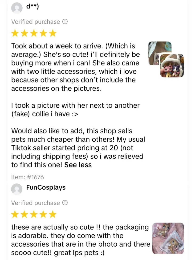These a great quality and super cute! They come with stickers and a pin from the shop. If you are thinking of getting these I recommend you getting them. My favorite lps shop ever!!💕 Product quality: Great. Appearance: Amazing. Color: Just great.
