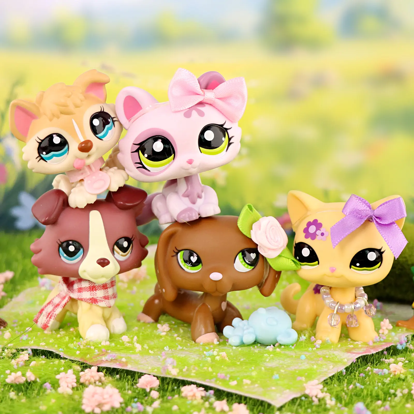 5 Pcs Little Pet Action Bobble-head Figures Dashchund #556 Puppy Husky #1013 Crouching Cat #1628 Collie #1262 Shorthair Cat #1962 with Cute Accesoires for Pet Collection Kids Gift Girl Play Figure Animal