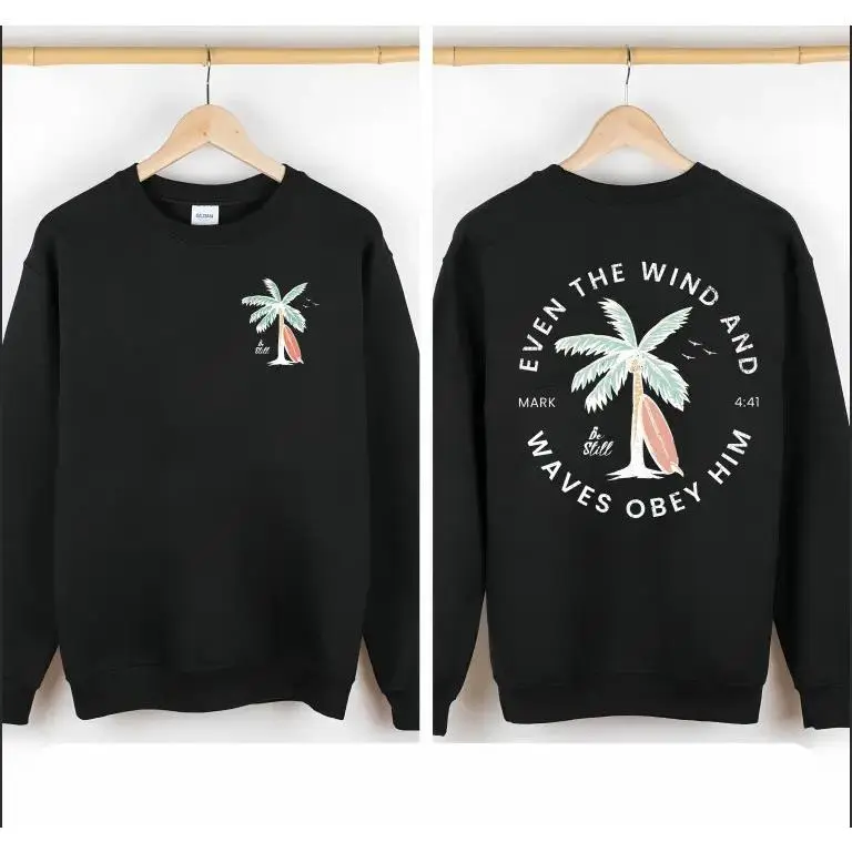 Christian Bible Verse Pattern T Shirt, Beachy Backprint Tops, Trendy Coconut Tree Shirt Unisex Tee Teen Baptism Gift Ocean Inspired Style Womenswear Printed