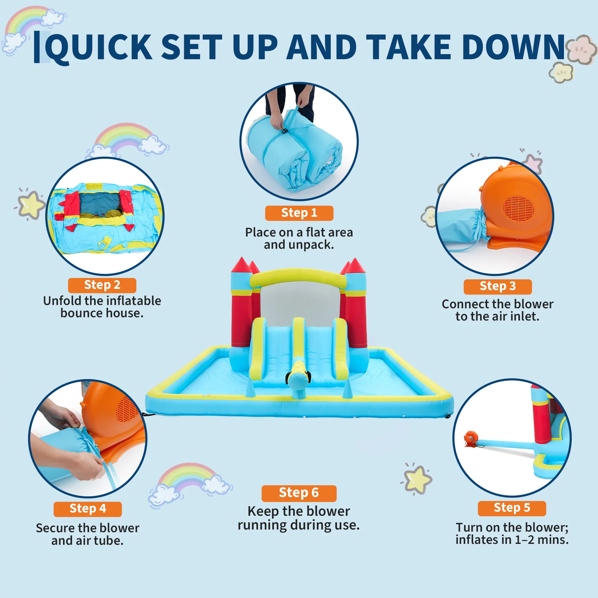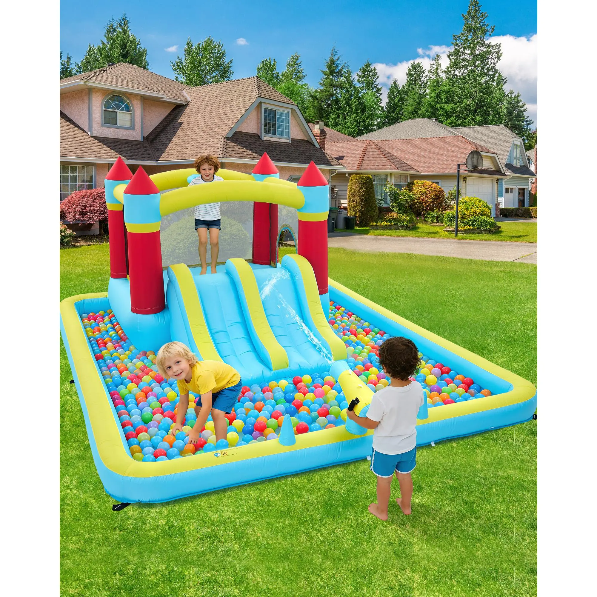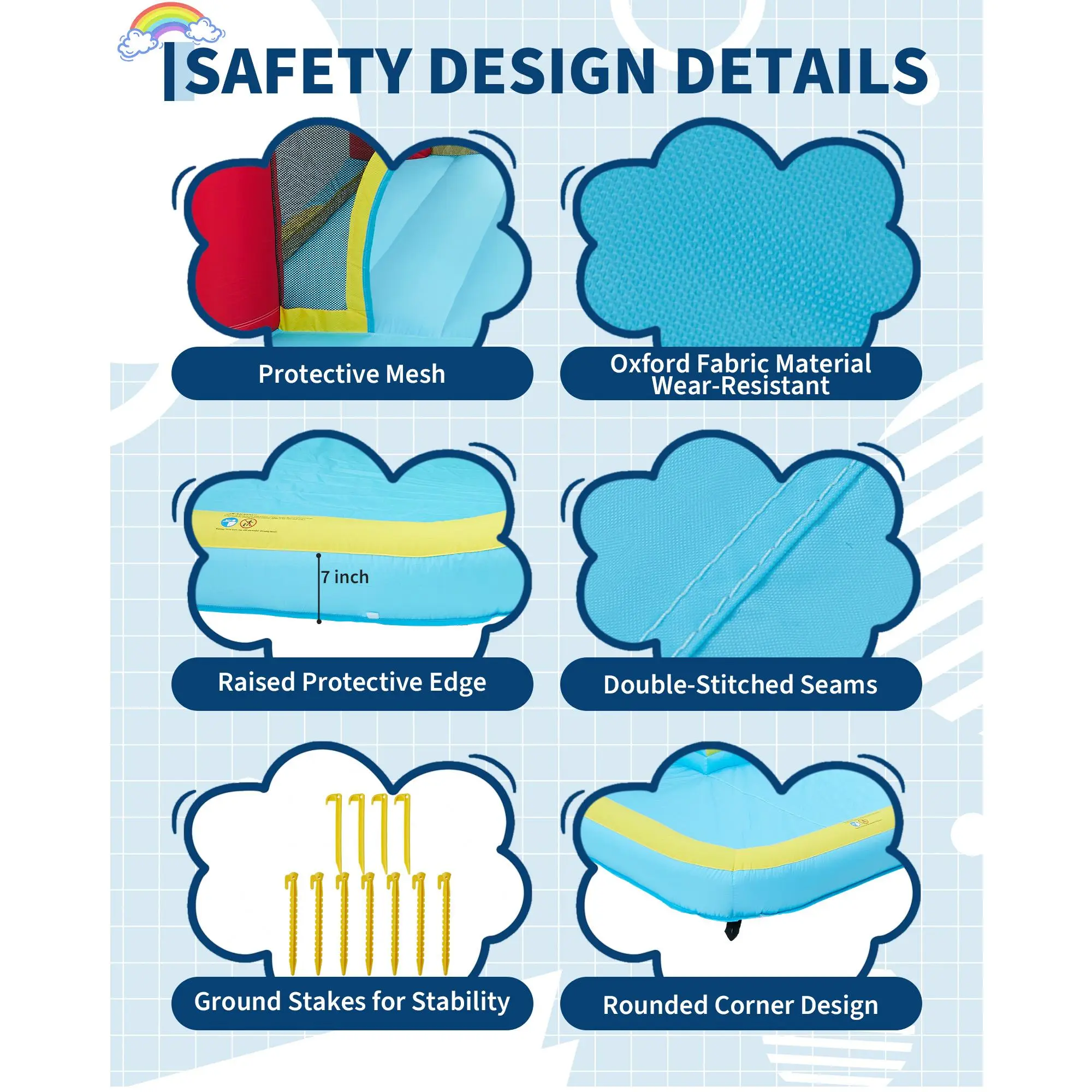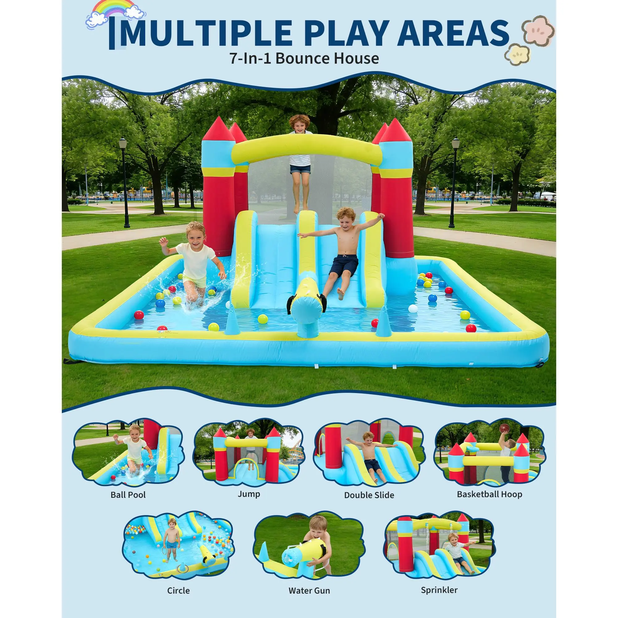 ·1.7-in-1 Outdoor Adventure: Features jumping, climbing, sliding, basketball, ring toss, splash pool, and water guns for multi-functional fun.