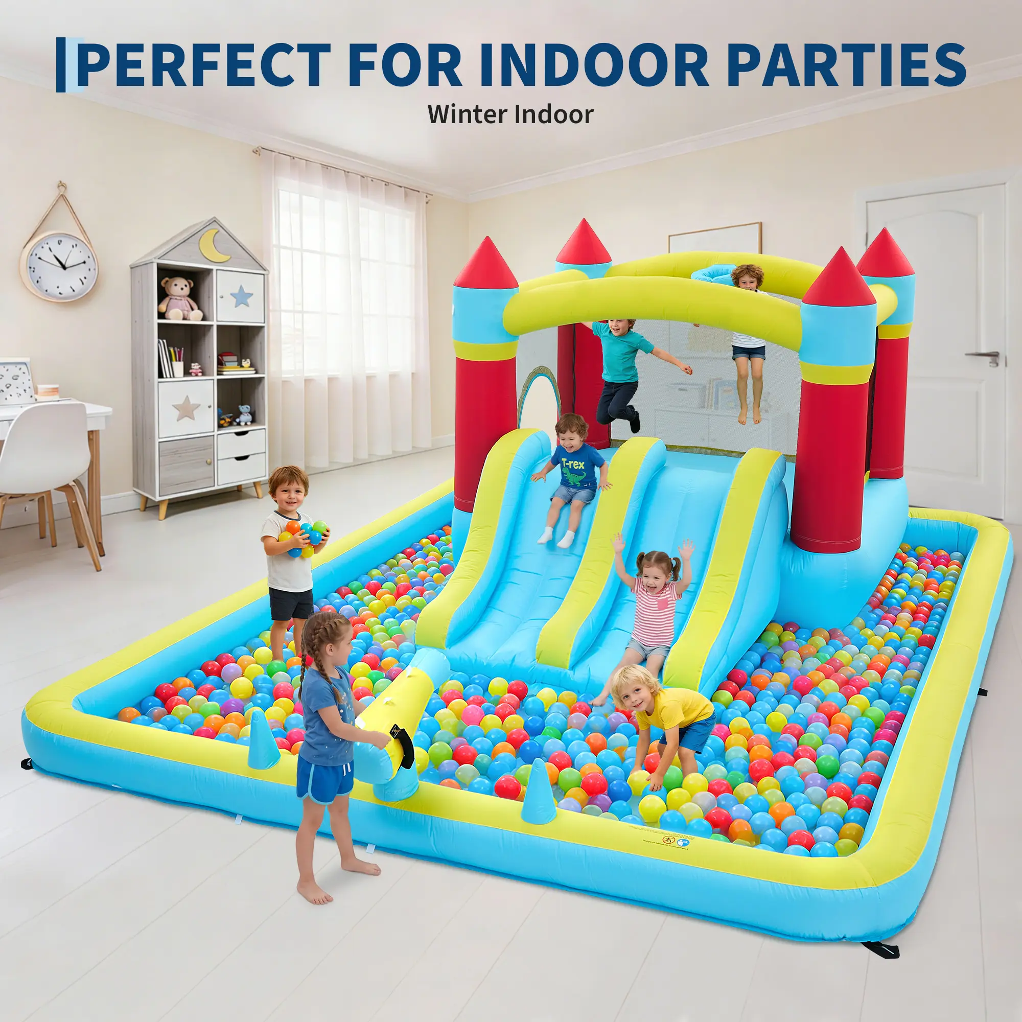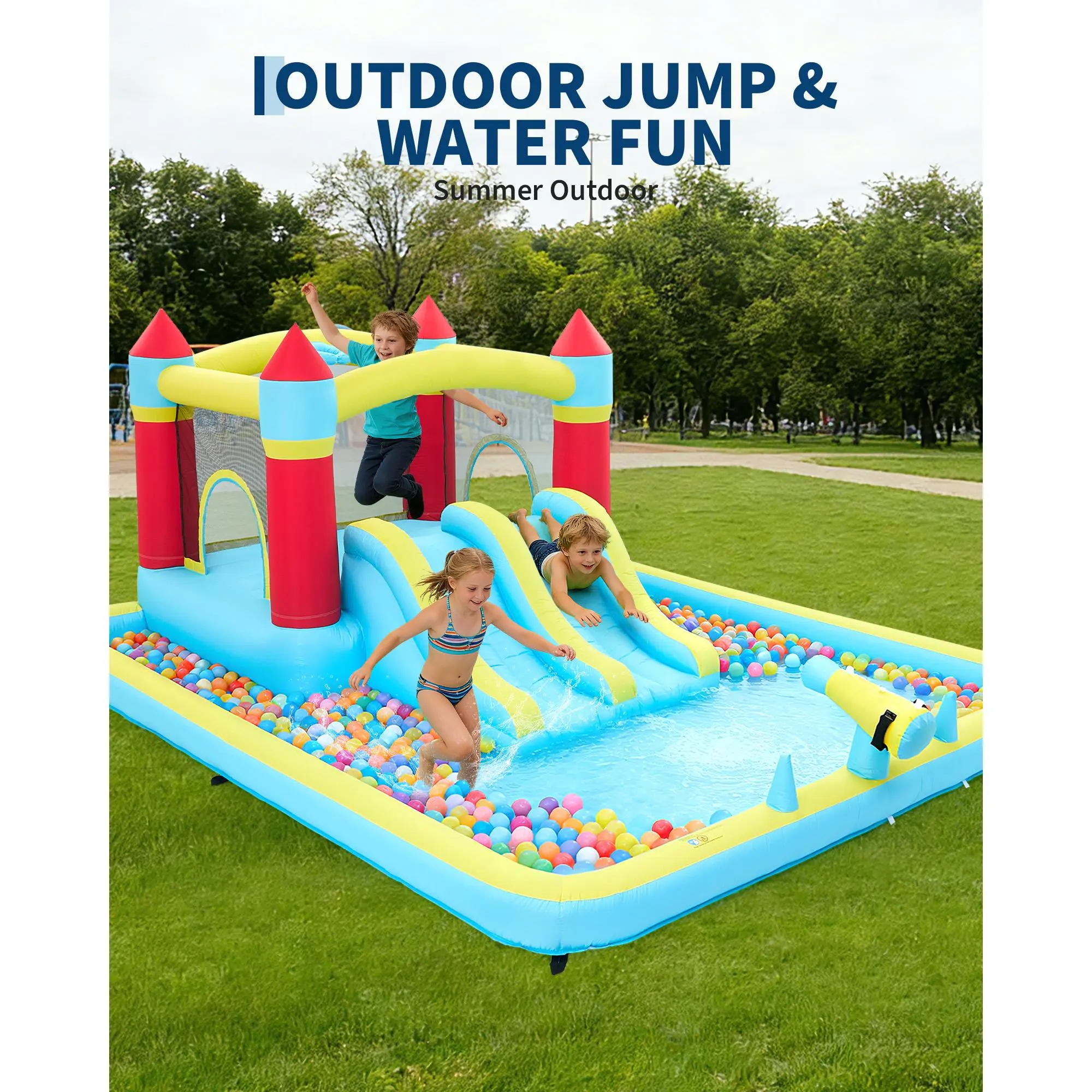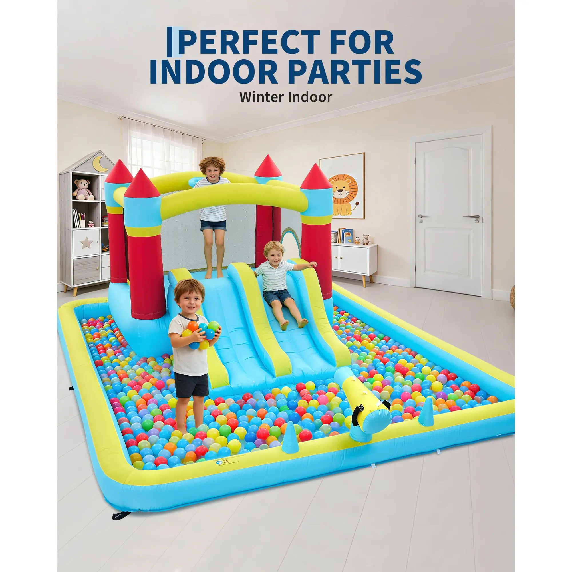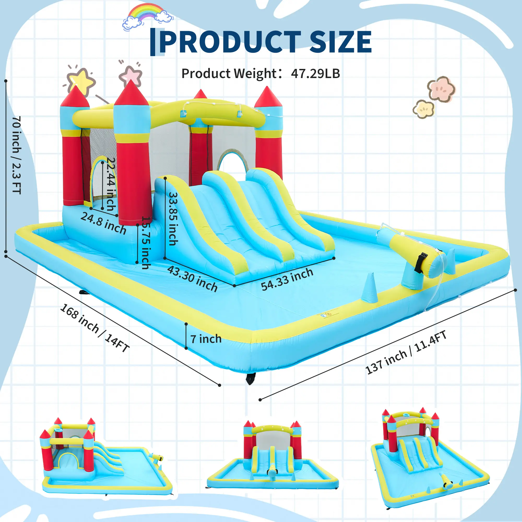 ·1.7-in-1 Outdoor Adventure: Features jumping, climbing, sliding, basketball, ring toss, splash pool, and water guns for multi-functional fun.