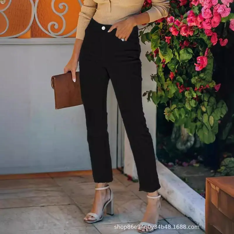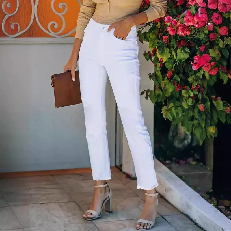 White Frayed Hem Cropped Jeans Straight Leg Cigarette Pants Womenswear Bottom Trouser Streetwear