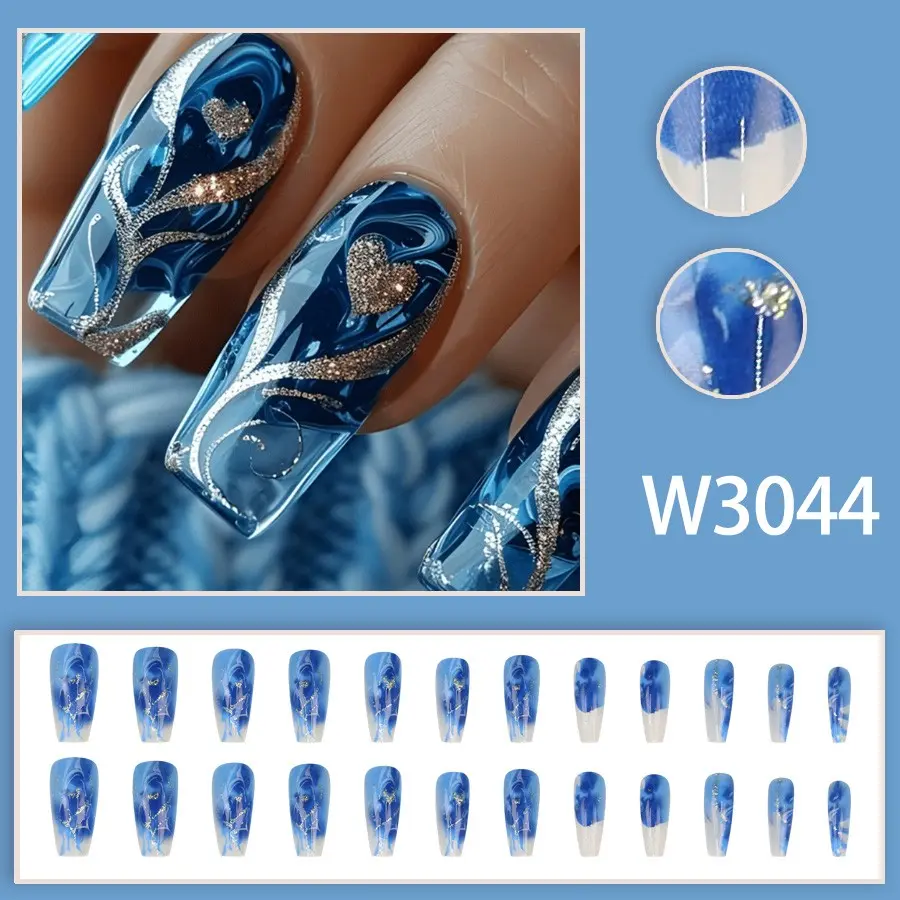 24-Piece Coffin Nail Set, Deep Blue Heart Design, Full Size Fit, Luxurious Glass Texture Sparkle, Tiktok Trending Manicure Kit