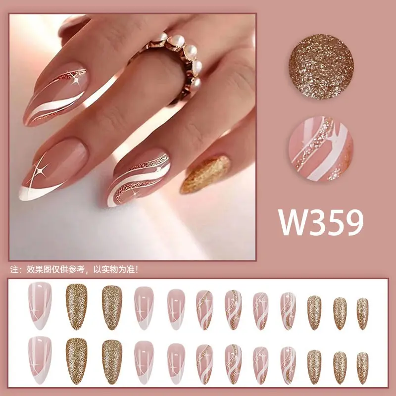 24-Piece Square Nail Art Set, Nude Color Gold Glitter Sparkle Design, Perfect for Office & Party Use, High-Quality Manicure Accessories