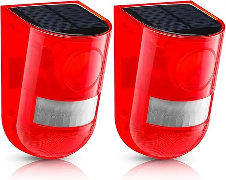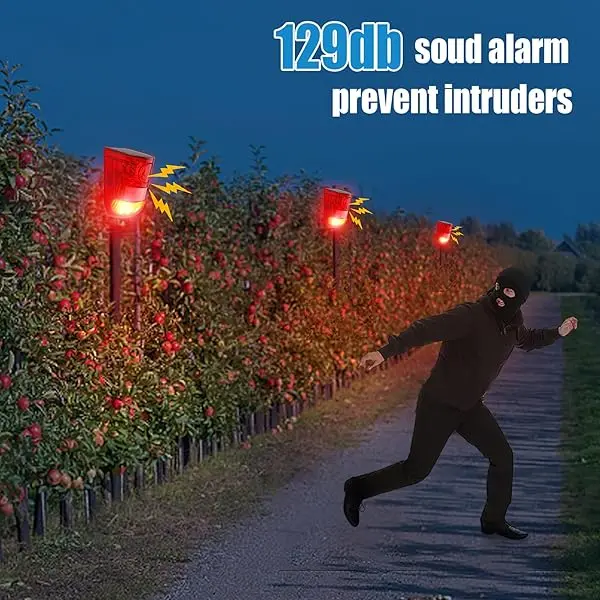 ·Motion Sensor Design: the solar alarm motion sensing angle is 125 that will detect any movement within 5-8 meter and activate the sound light alarm, the sound arise and strobe light on; The solar lamp siren horn sound is 129 dB that can be heard from 1000 m away, and the flash strobe lighting can be seen from 1000 m that protect your farm from thief entering
