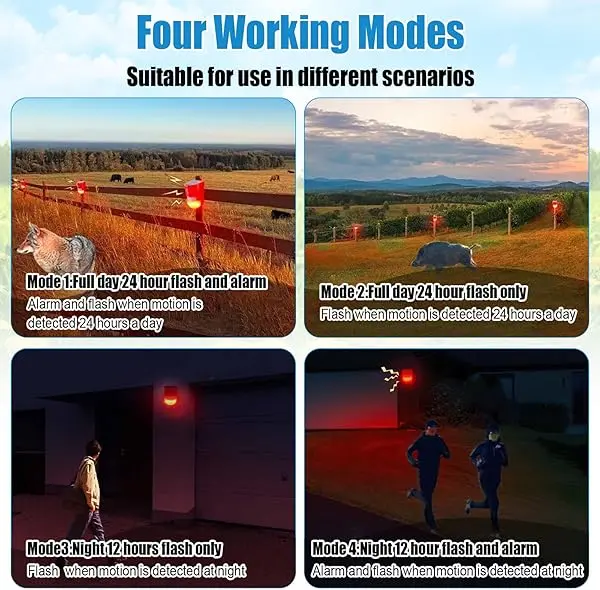 ·4 Modes Function: our strobe light alarms offer 4 modes: 24 hours with flash and alarm, 24 hours with flash but without alarm, at the night with flash and alarm (not working during the day, working at night), at the night with flash only; You can choose the right mode according to your needs and improve security