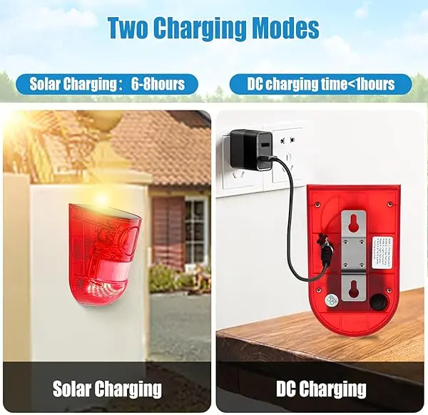 ·Easy Installation: the solar light alarm comes with a detailed instruction manual that the installation process is simple to complete; In addition, the alarm lasts up to 30 days and only needs to be charged once for continuous operation; You can choose solar powered and DC charging; Please hang solar strobe alarm where get enough sunlight