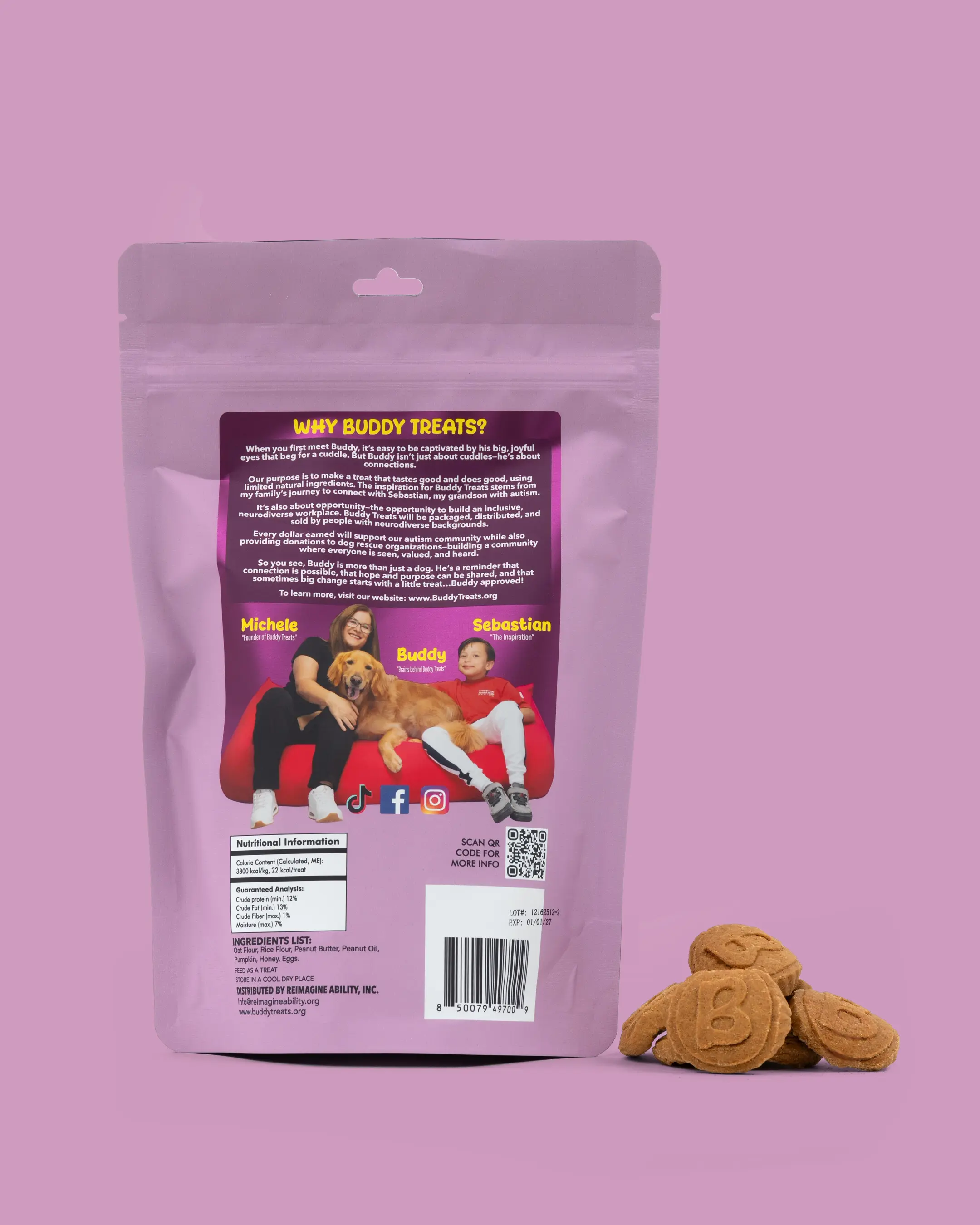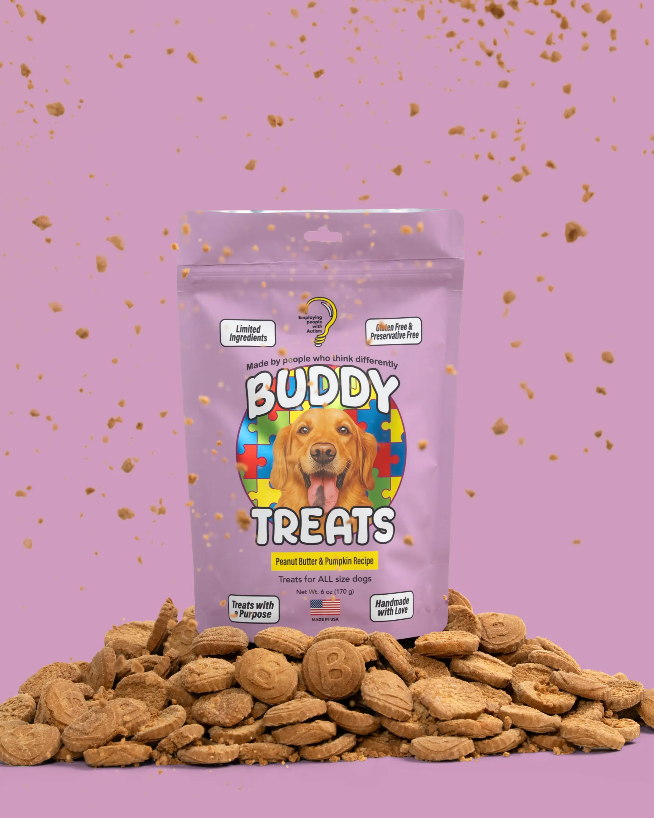 Buddy Treats official launch will be in April for two very important reasons: First, it's Autism Awareness month. Second, it's Buddy's Birthday! Buddy Treats is a crunchilicious dog treat that tastes good and does good. Using a pumpkin and peanut butter base, we use limited ingredients to create a healthy, gluten and preservative-free dog treat. Buddy Treats is also a social enterprise that uses business to create a meaningful and sustainable social impact. ALL proceeds will benefit autism and dog rescue organizations. Our treat is packaged and sold by people on the autism spectrum, creating jobs and opportunity where few existed. So you see that when we say “made by people who think differently”... we mean it.