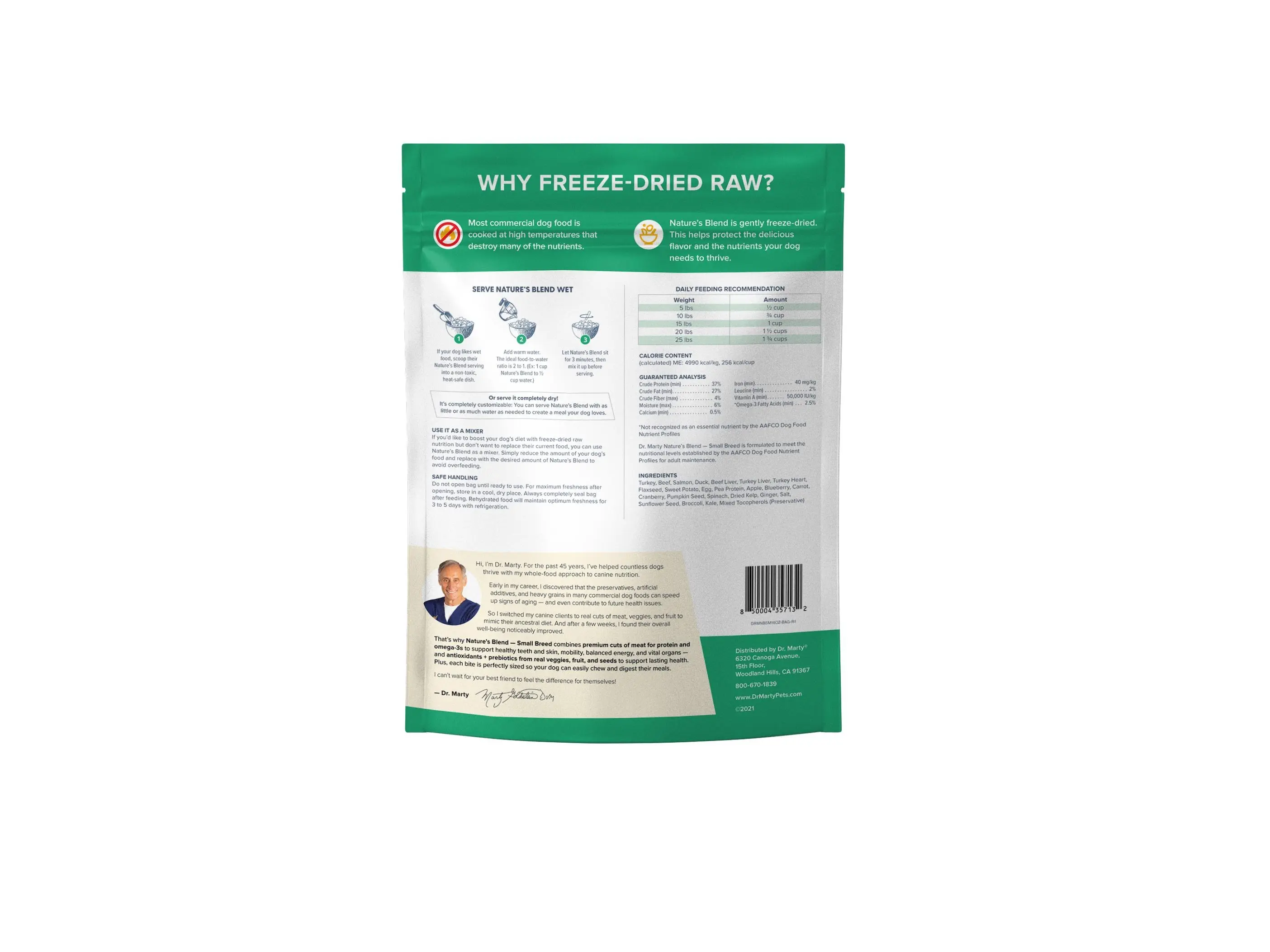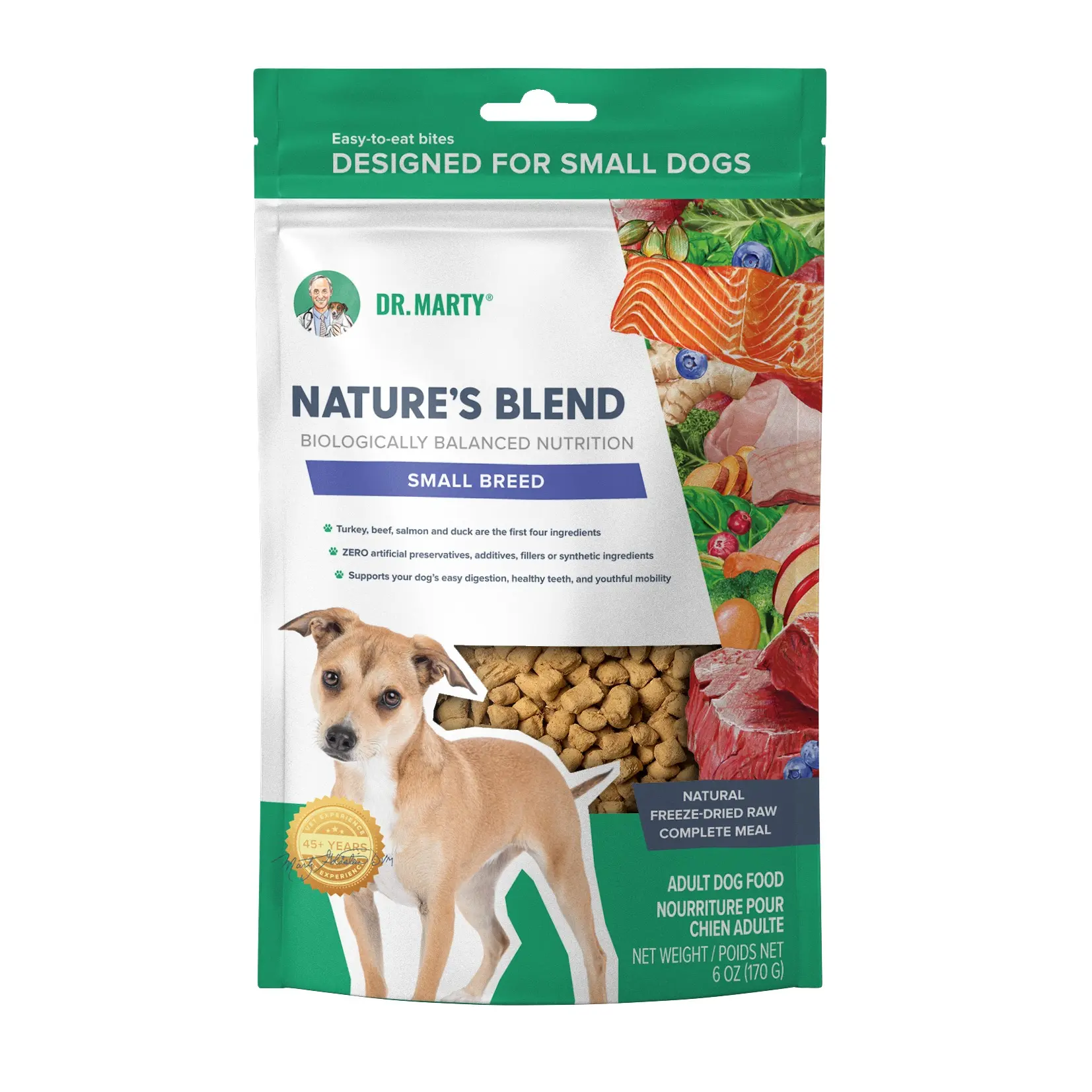 Dr. Marty Nature's Blend Small Breed Freeze-Dried Raw Dog Food features 81% real meat in bite-sized pieces designed for small dog mouths with 37% protein and 2.5% omega-3 fatty acids. Gentle freeze-drying preserves nutrients and amino acids, supporting lean muscle, healthy coat, and joint mobility without artificial preservatives or fillers.