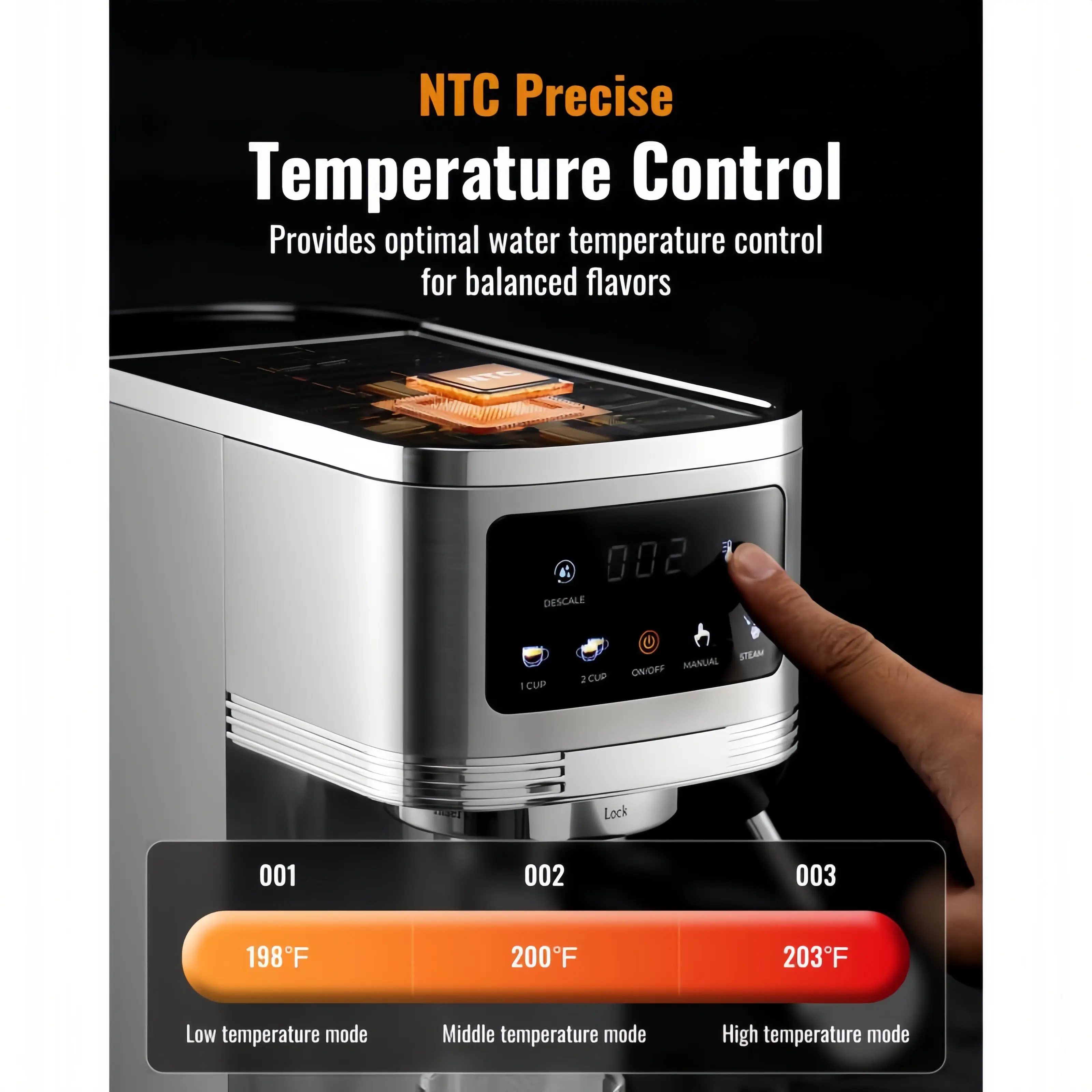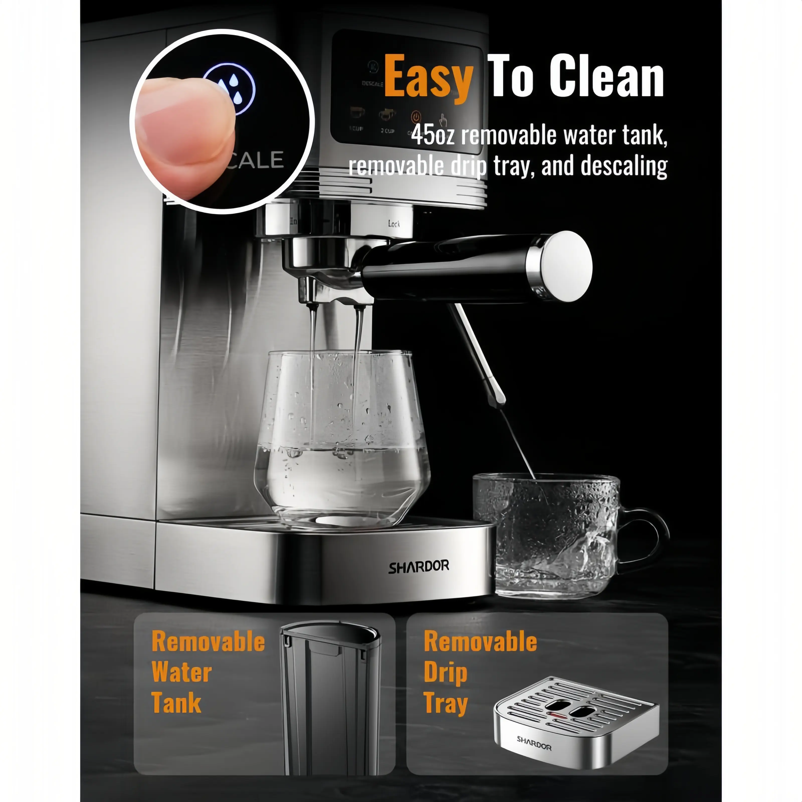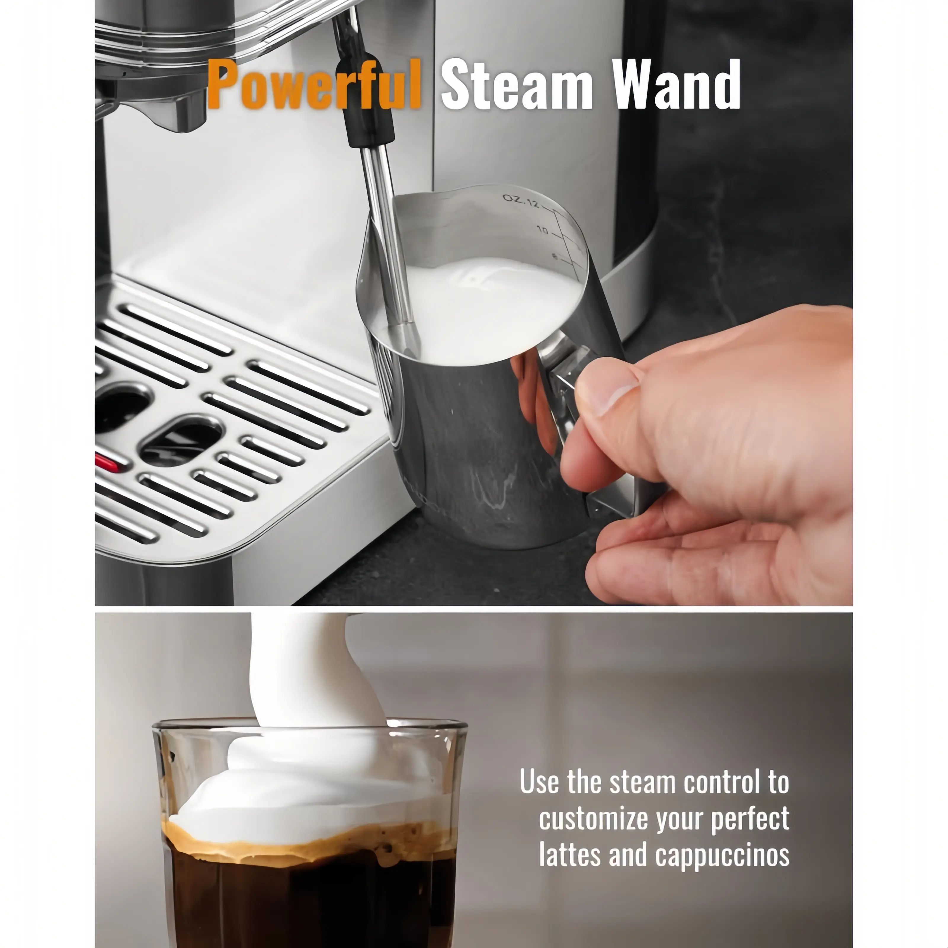 •Powerful 20 Bar Pressure:This semi-automatic espresso maker features a 20-bar pump and a 1350W motor.It ensures rich coffee flavor and aroma.Perfect for making cappuccinos, lattes, and flat whites at home or in the office.The stainless steel construction adds durability and elegance.