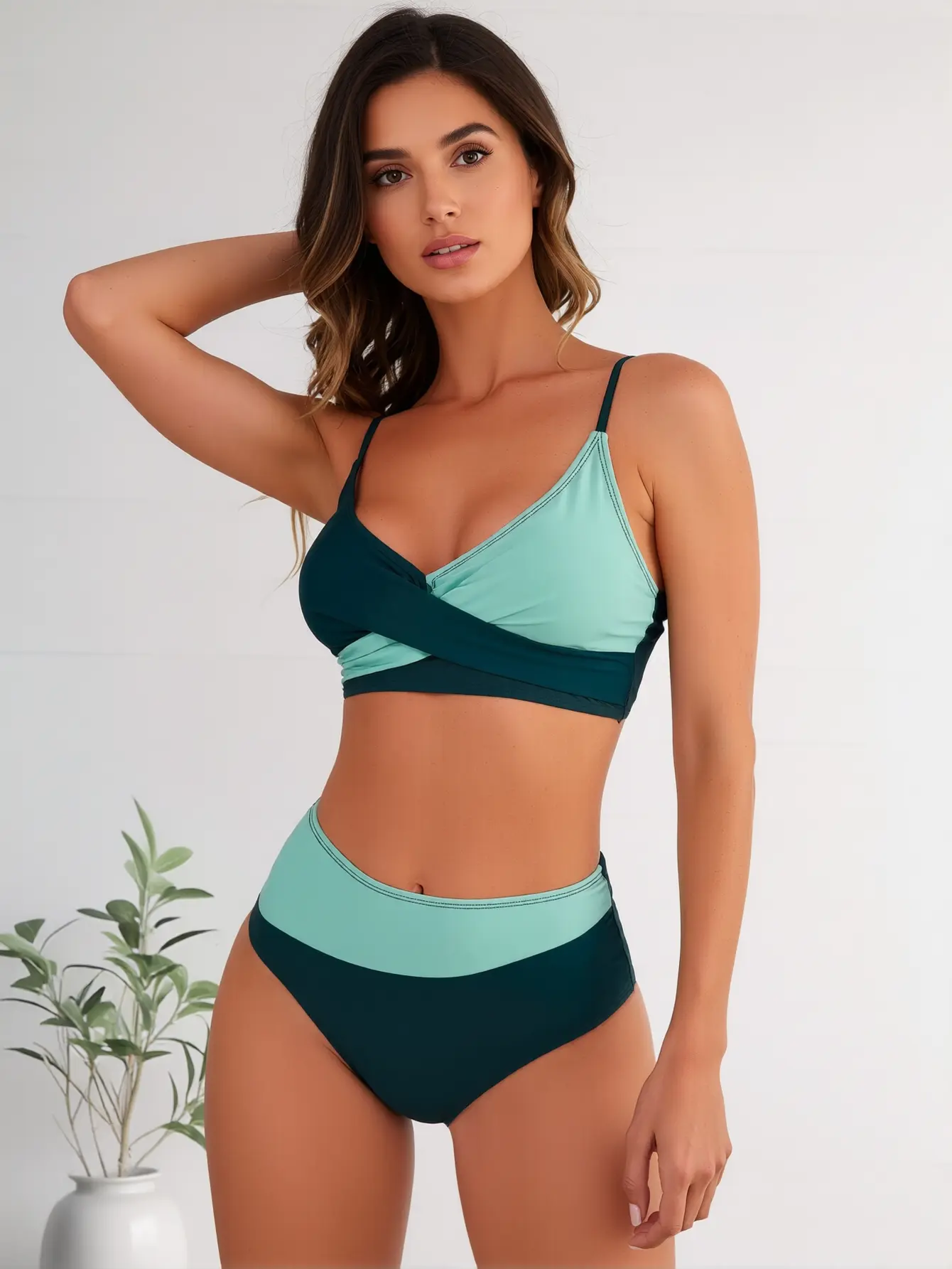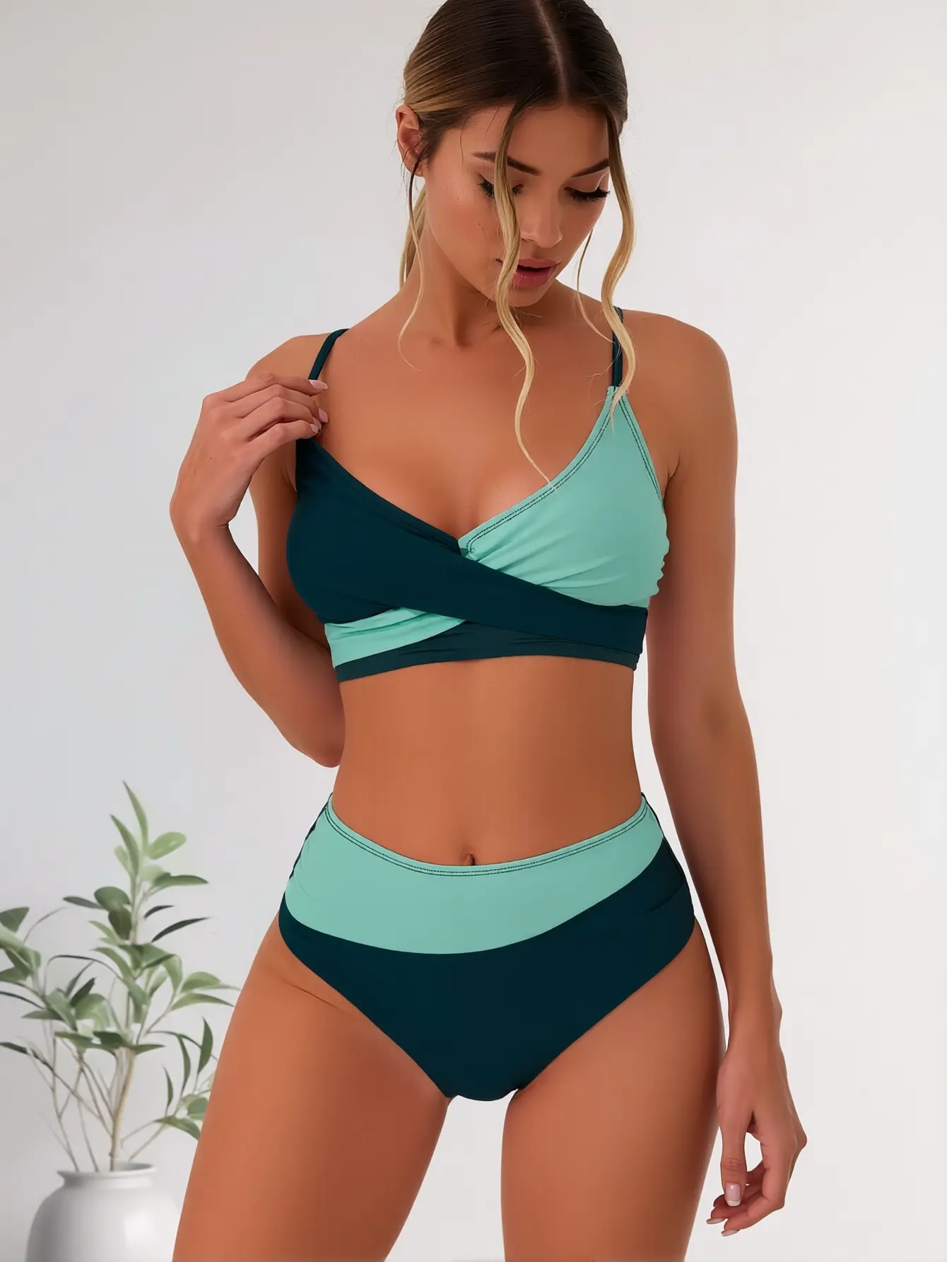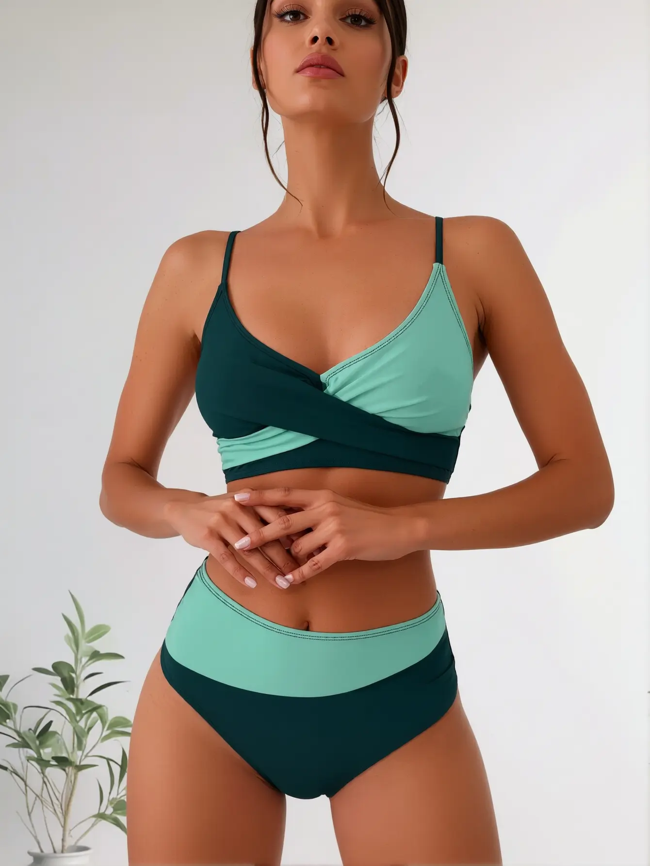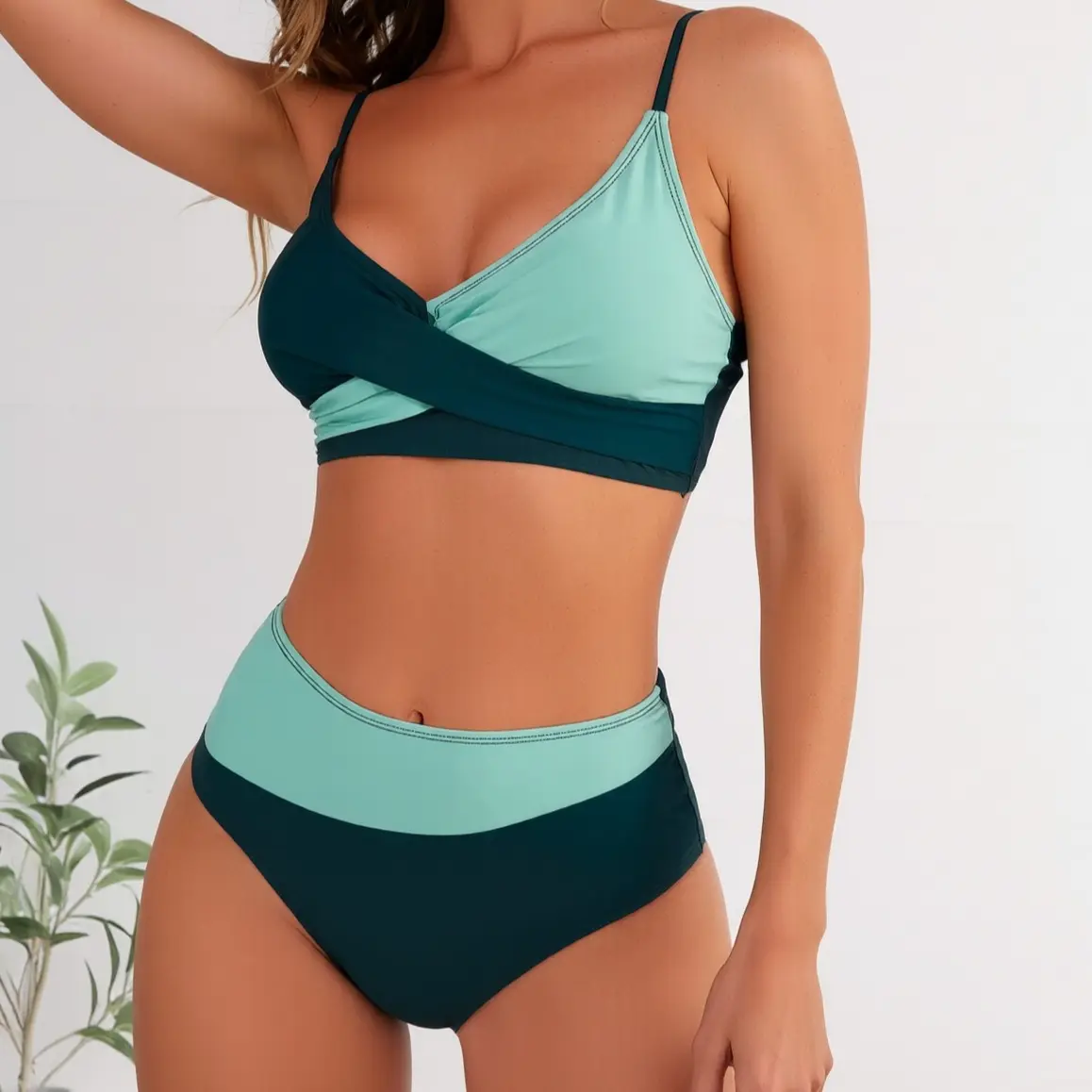 ·Striking Two-Tone Color-Block Design: This eye-catching bikini set features a bold contrast of soft mint teal and deep forest green, creating a visually slimming effect that flatters all body types and skin tones. The seamless color-blocking adds a modern, fashion-forward touch to your beach look.