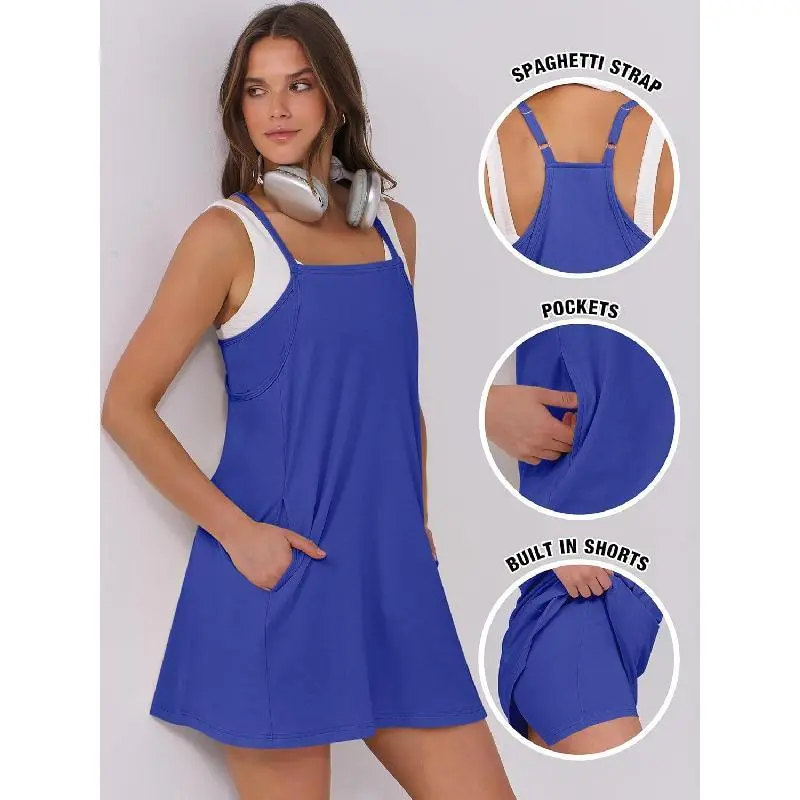 SCUSTY Women's Summer Sleeveless Mini Dress with Built-in Shorts V Neck Spaghetti Straps Athletic Shorts Tennis Dress with Pockets