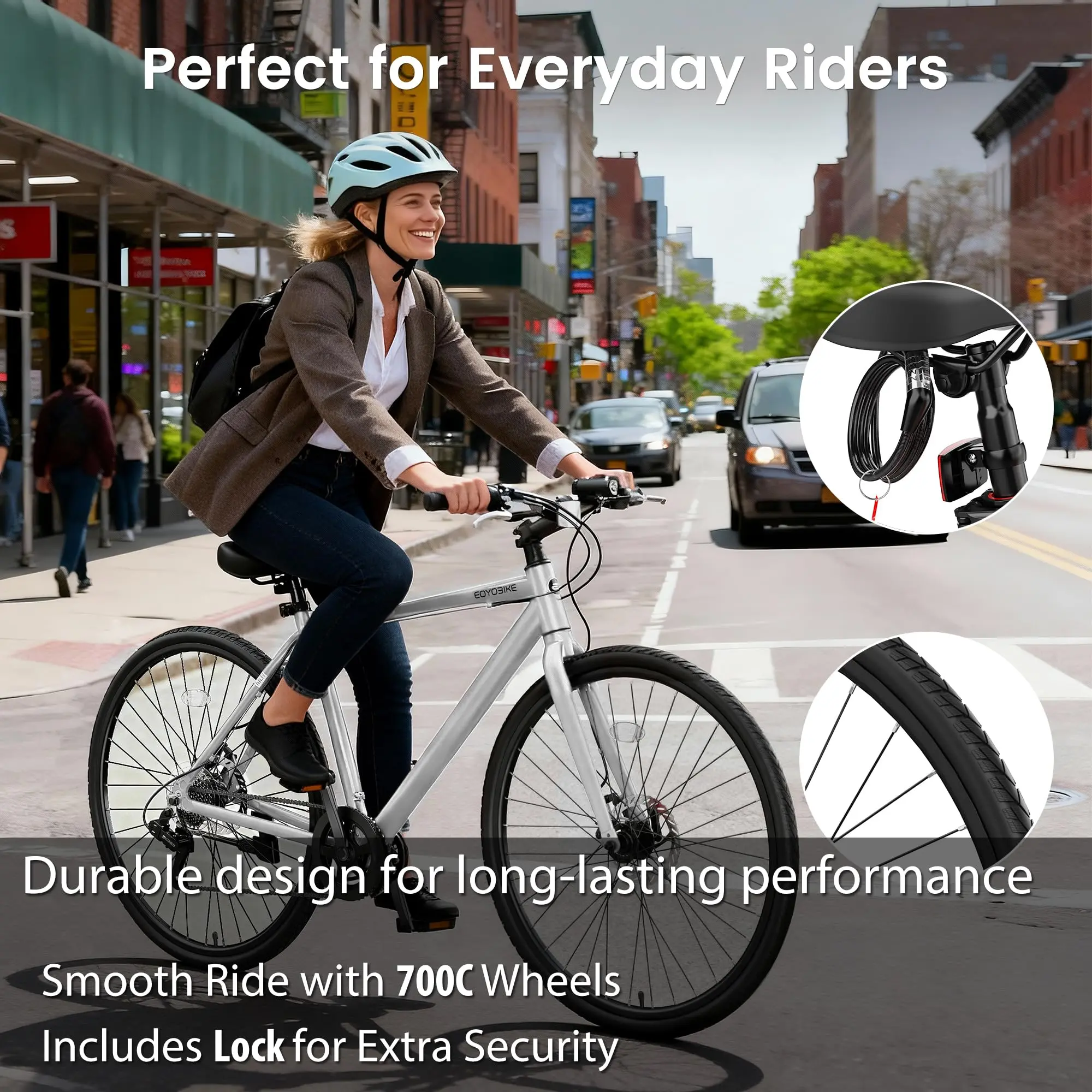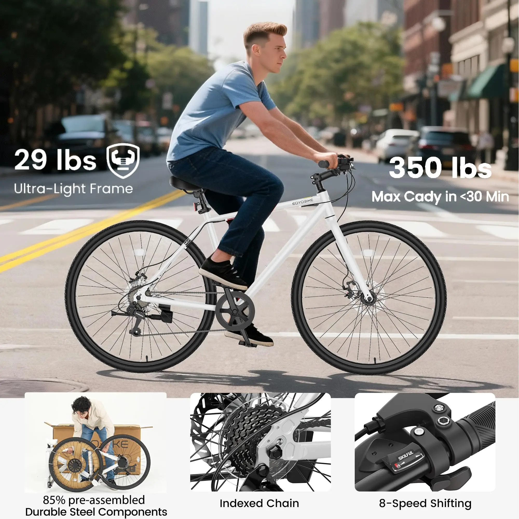 ·【Ultimate Lightweight Commuter】 Weighing in at only 29.5 LBS (13.4 KG) thanks to the premium Aluminum Frame, making it one of the lightest hybrid bikes in its class. Effortless to carry upstairs, load onto bus racks, and maneuver through traffic.