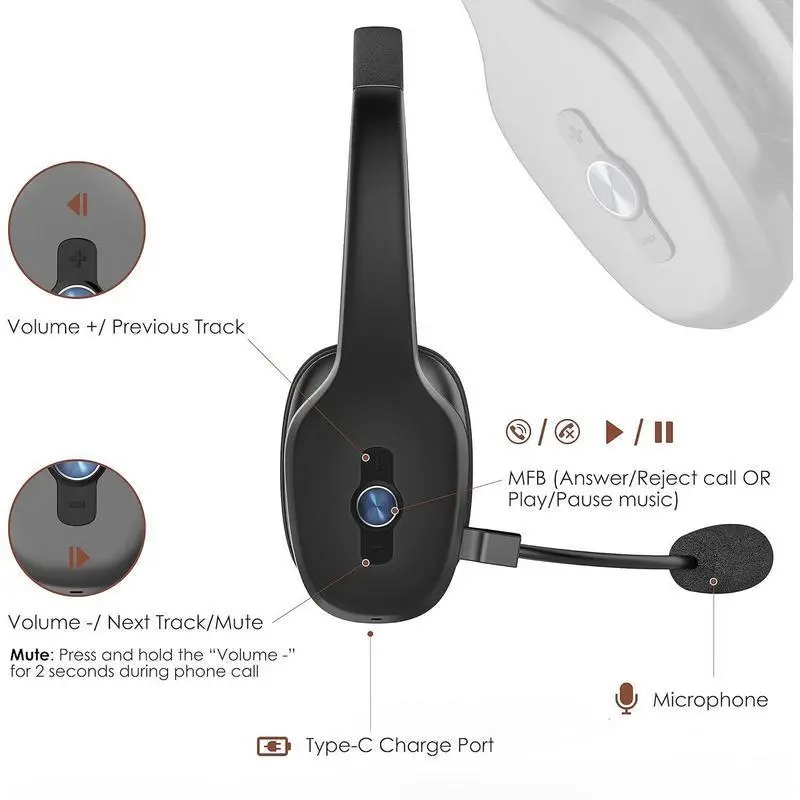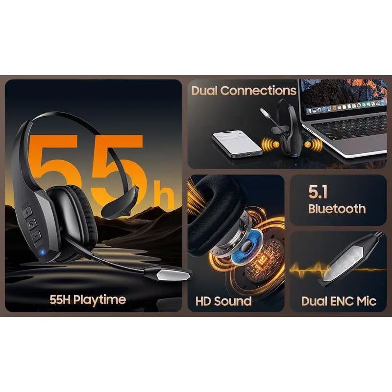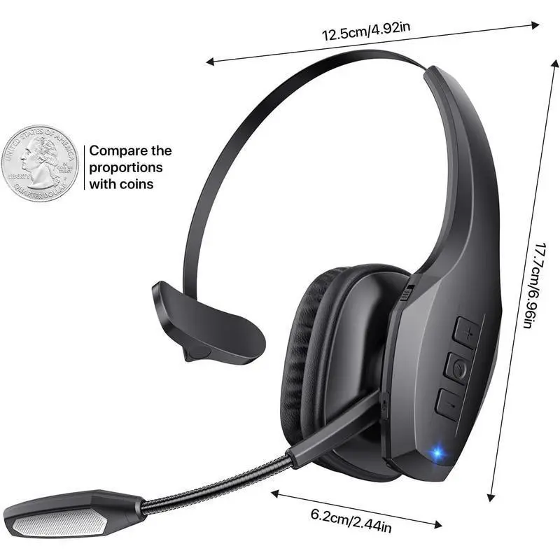 Welcome to our small shop, we guarantee quality. Please choose the SKU you want and feel free to contact us if you have any questions before or after purchasing Experience Effortless Communication, Anywhere: Our Bluetooth headset incorporates cutting-edge AI noise reduction technology, delivering premium sound quality that effectively blocks 95% of background noise.Enjoy a crystal-clear, lifelike calling experience akin to in-person conversations. Extended 55Hrs Battery Life: With a swift 2-3 hours charging time, our Trucker Bluetooth headset offers an extended battery life of up to 36 hours of talk time, 55 hours music time and 80 days of standby time. Drive, commute, meeting or work from home without the hassle of frequent recharging, empowering you to make calls or attend meetings at your convenience. All-Day Comfort for Prolonged Wear: Crafted with soft, breathable earmuffs and an ultra-soft adjustable headband, our bluetooth headset features a 270 �� rotatable design for both earmuffs and microphone, ensuring prolonged comfort and easy to switch and left/right ear available.Ideal for extended use, this wireless headset is perfect for work, promising day-long comfort. Seamless Connection to 2 Devices: Effortlessly connect our bluetooth headset to two Bluetooth devices simultaneously.Never miss important calls or meetings while enjoying your favorite music.Compatible with various Bluetooth-enabled devices, this headset ensures versatility. Extended 59ft Wireless Range: Enjoy unparalleled freedom of movement with our wireless Bluetooth headset, featuring an impressive working range of up to59ft/18m. Maintain clear and smooth call quality, even when your mobile phone isn't immediately accessible.